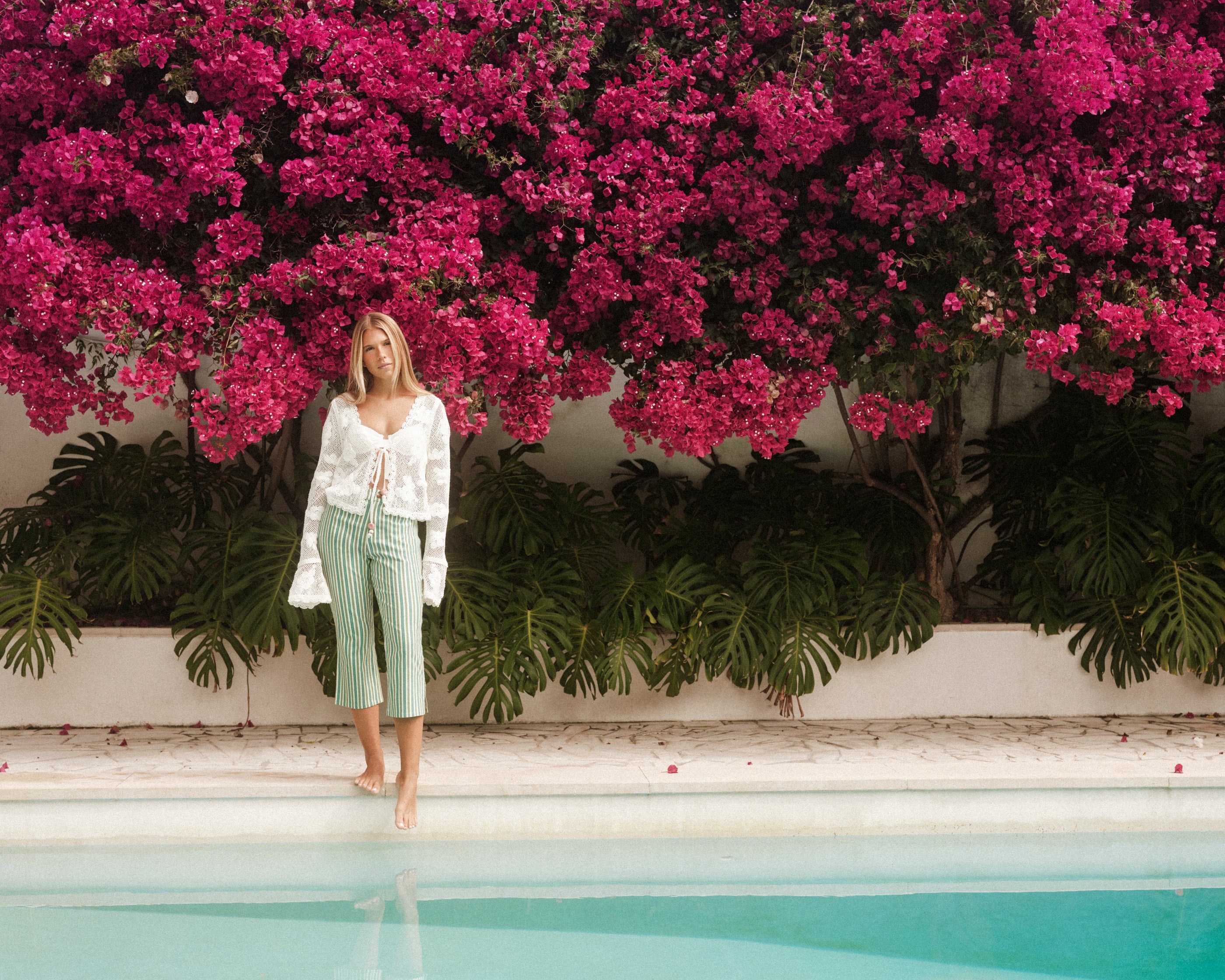 From the warm, glowing colour palette to the co-designed label, which mirrors the colours of a setting sun. The collection features 11 carefully designed pieces that together form the ideal summer wardrobe. Each item is designed to mix and match effortlessly, allowing for endless combinations.