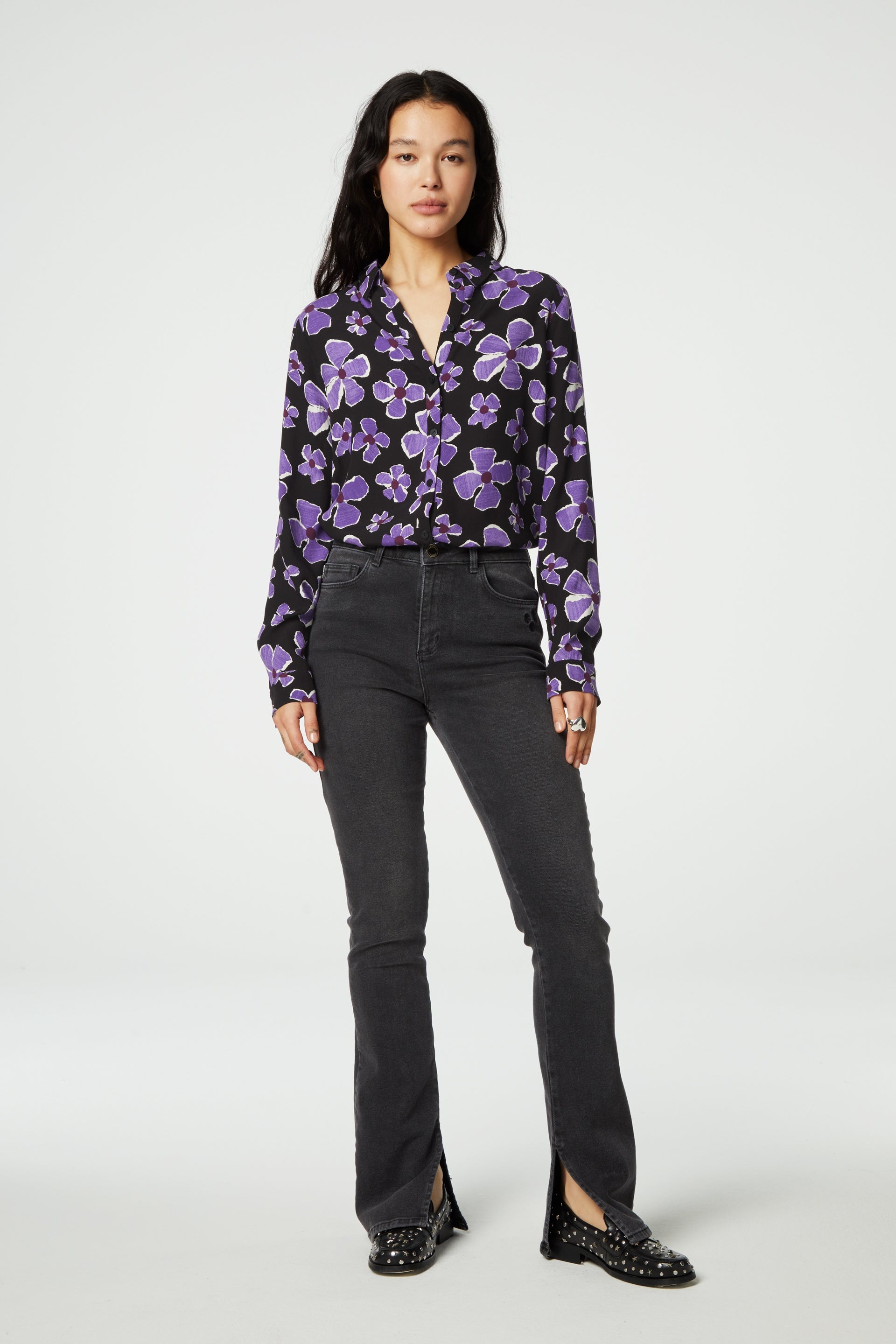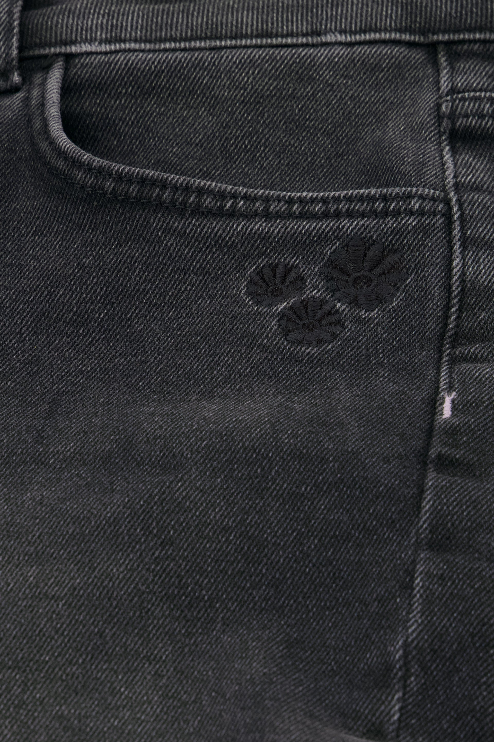 Mid-rise skinny trousers with button and zip closure and an embroidered heart on the back pocket. Eva Slim Split has two front and back pockets and a split at the leg.