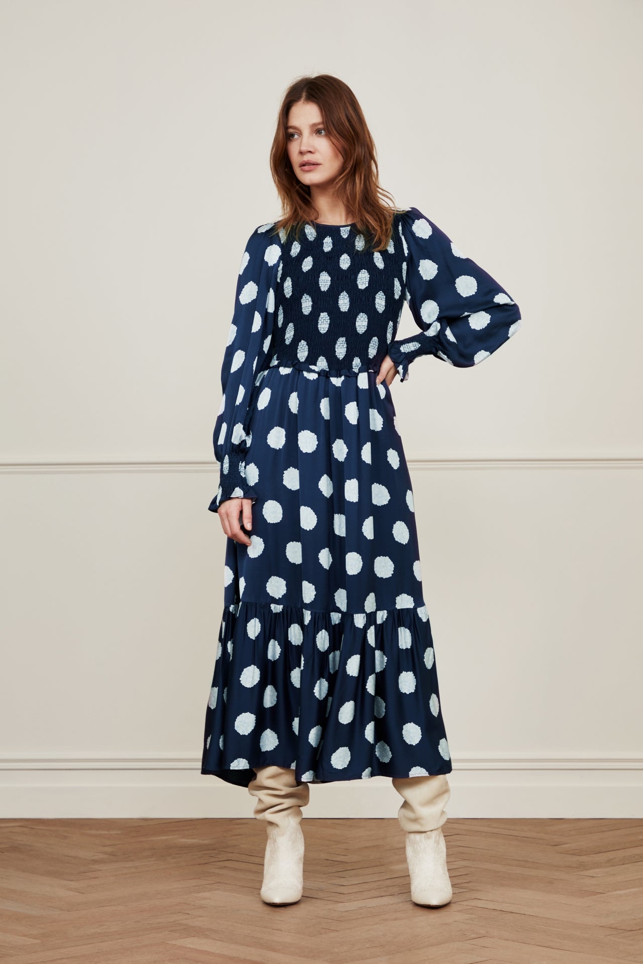 Midi jurk met gesmokte body en ballonmouwen. Caro Dress heeft een ronde hals en is wijduitlopend.