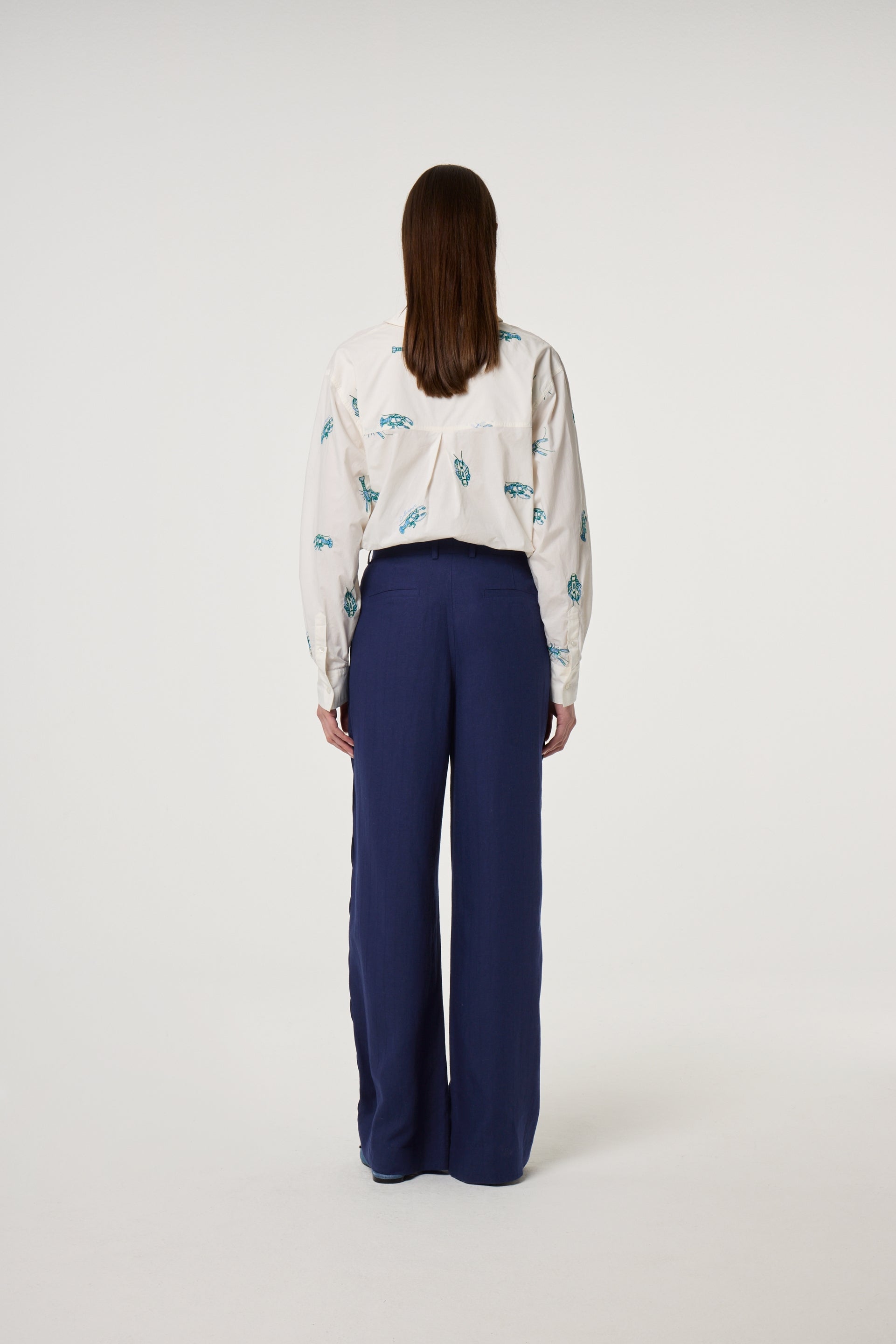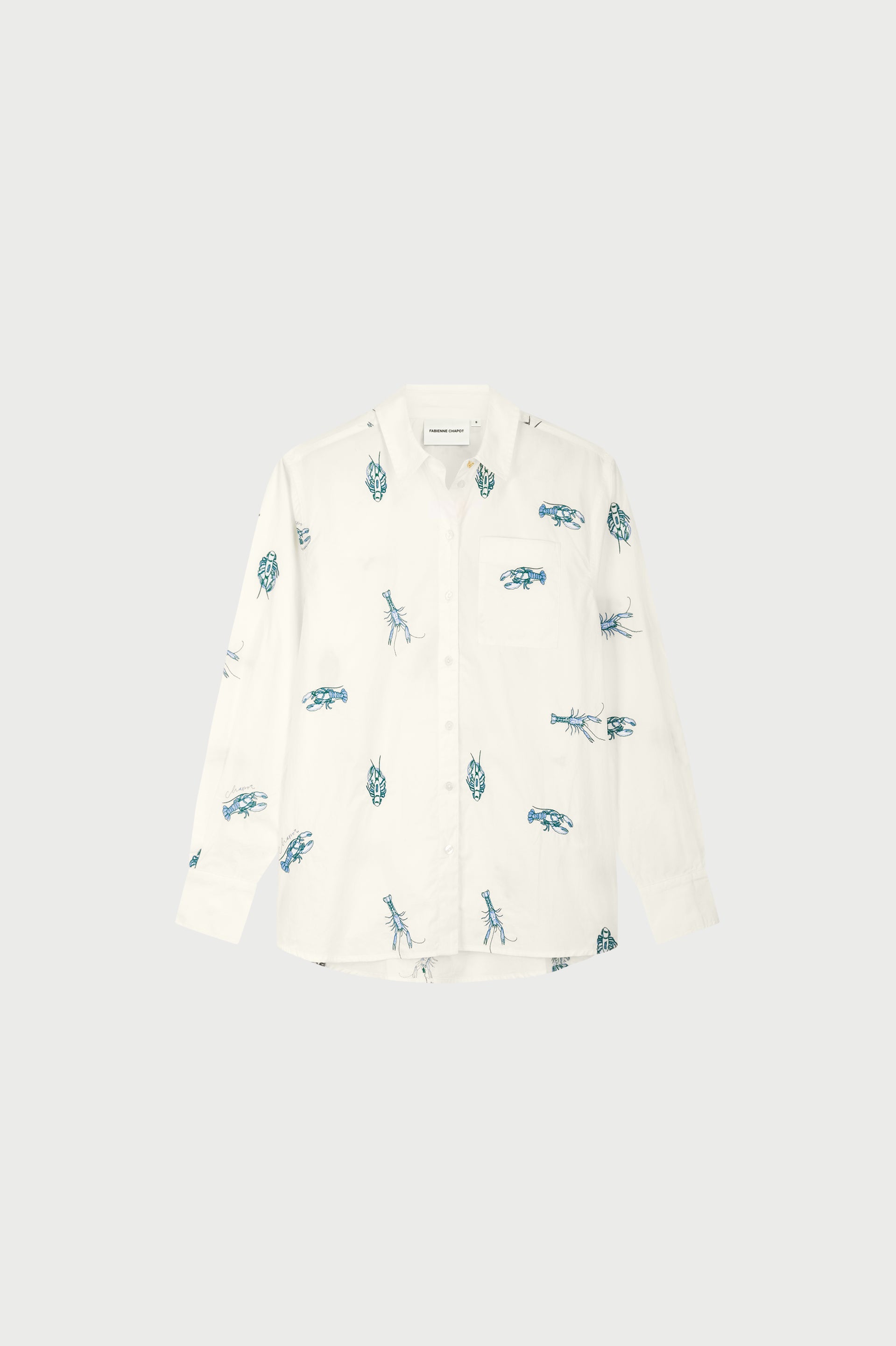This white long-sleeve blouse features an all-over blue langoustine print for a fun, unexpected twist. Designed in a loose fit with a single pocket on the left side, it feels relaxed and easy to wear. Slightly see-through for a light and airy feel, it’s made from 100% organic cotton, making it perfect for everyday styling with a bit of personality.