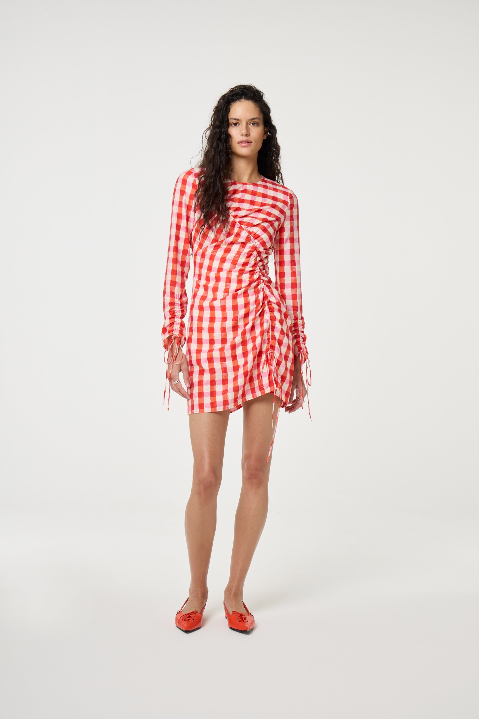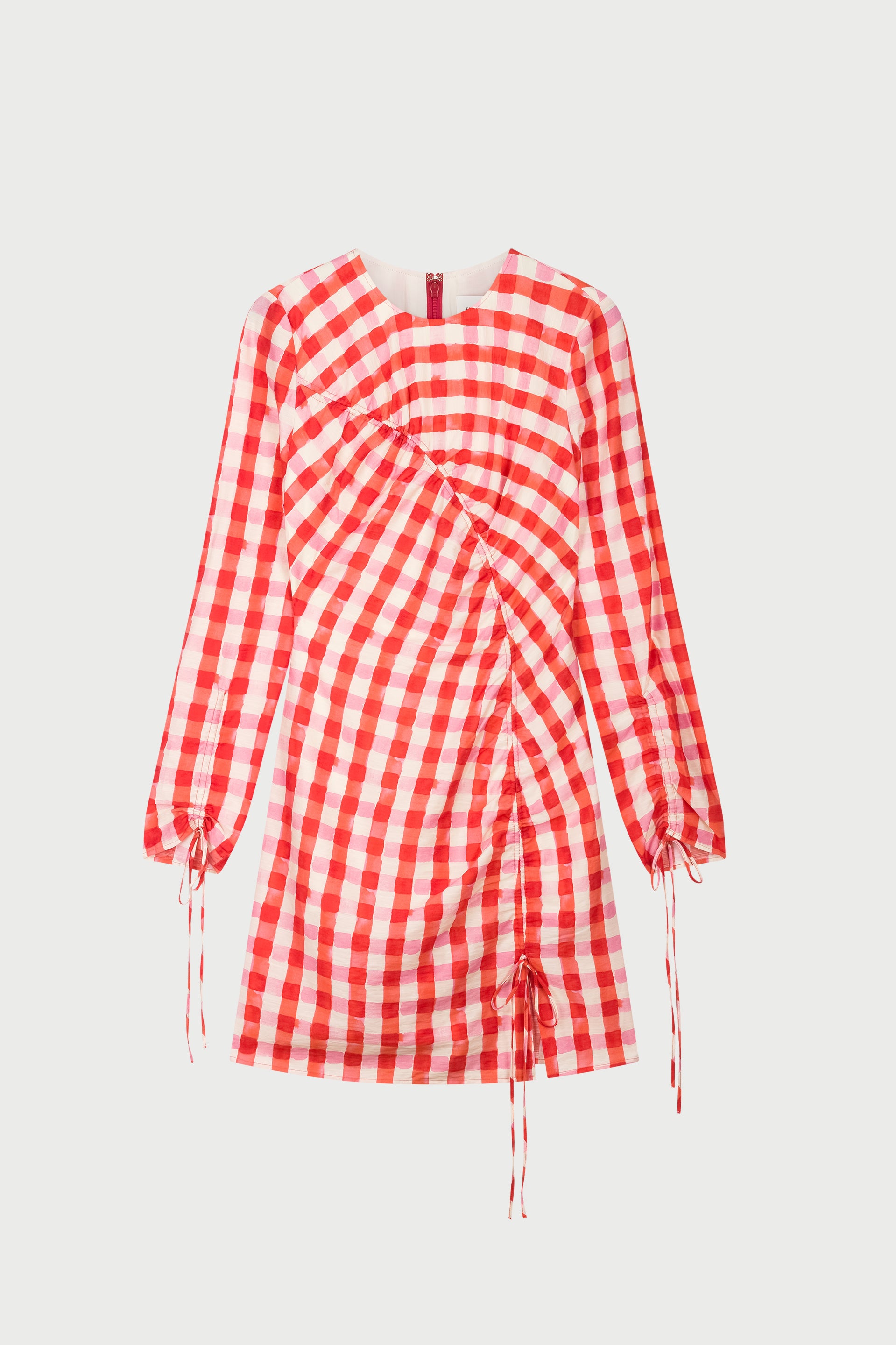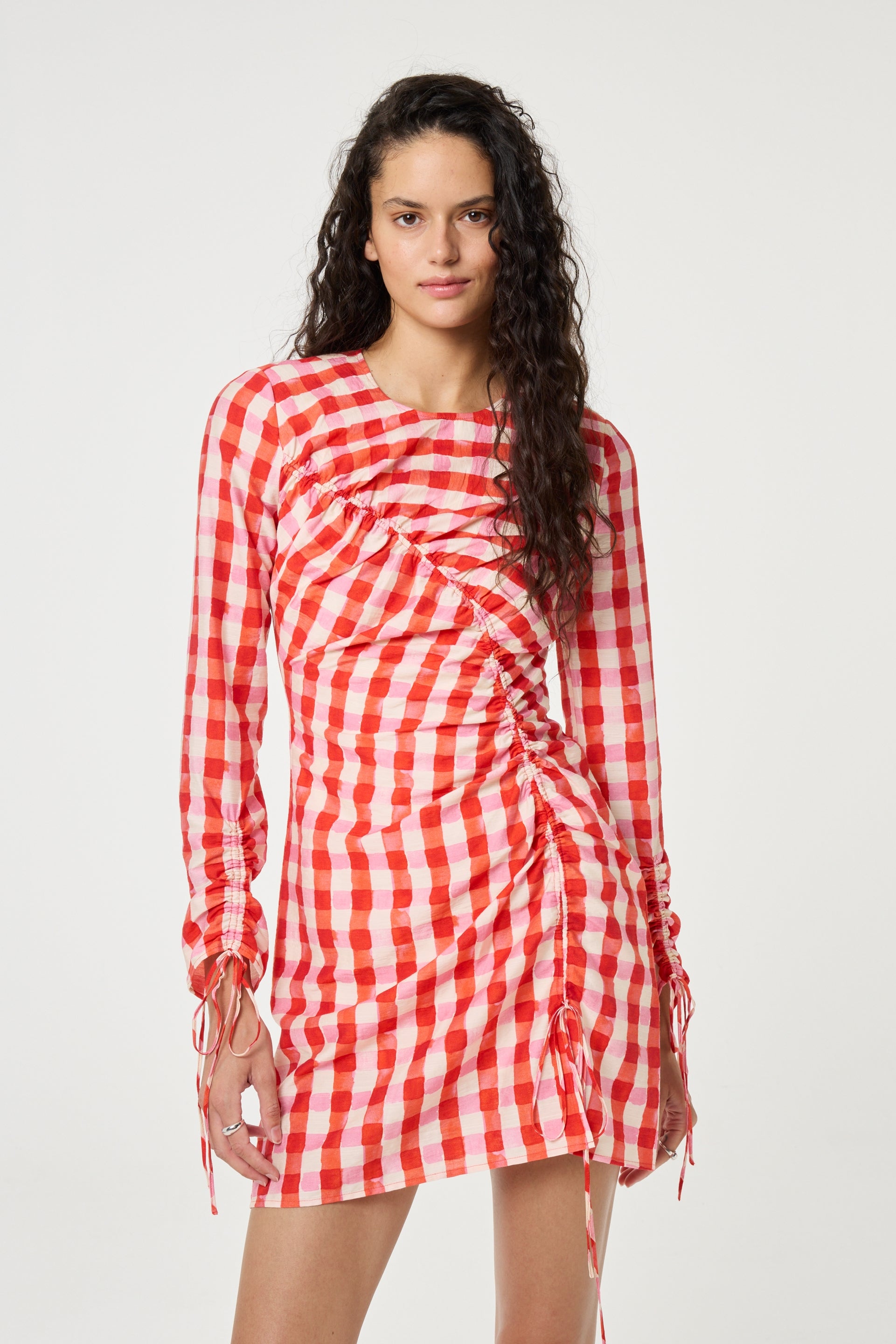 This checkered dress features a vibrant red, orange, and pink pattern for a bold, eye-catching look. Designed with adjustable strings for a customizable fit and a back zipper for easy wear, it’s finished with charming ribbon details at the sleeves and along the subtle bottom slit. Perfect for sunny days, festive outings, or standout moments.