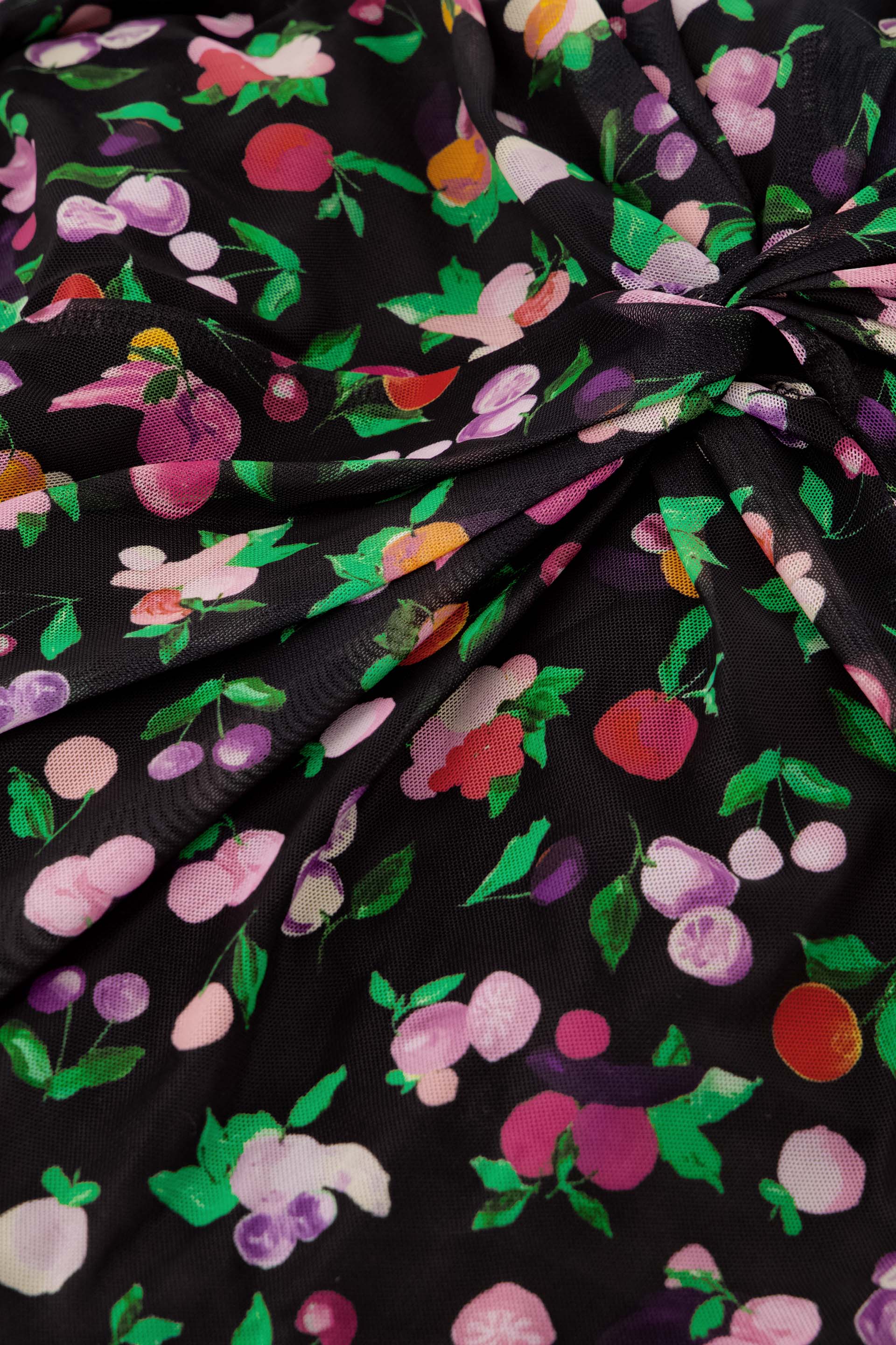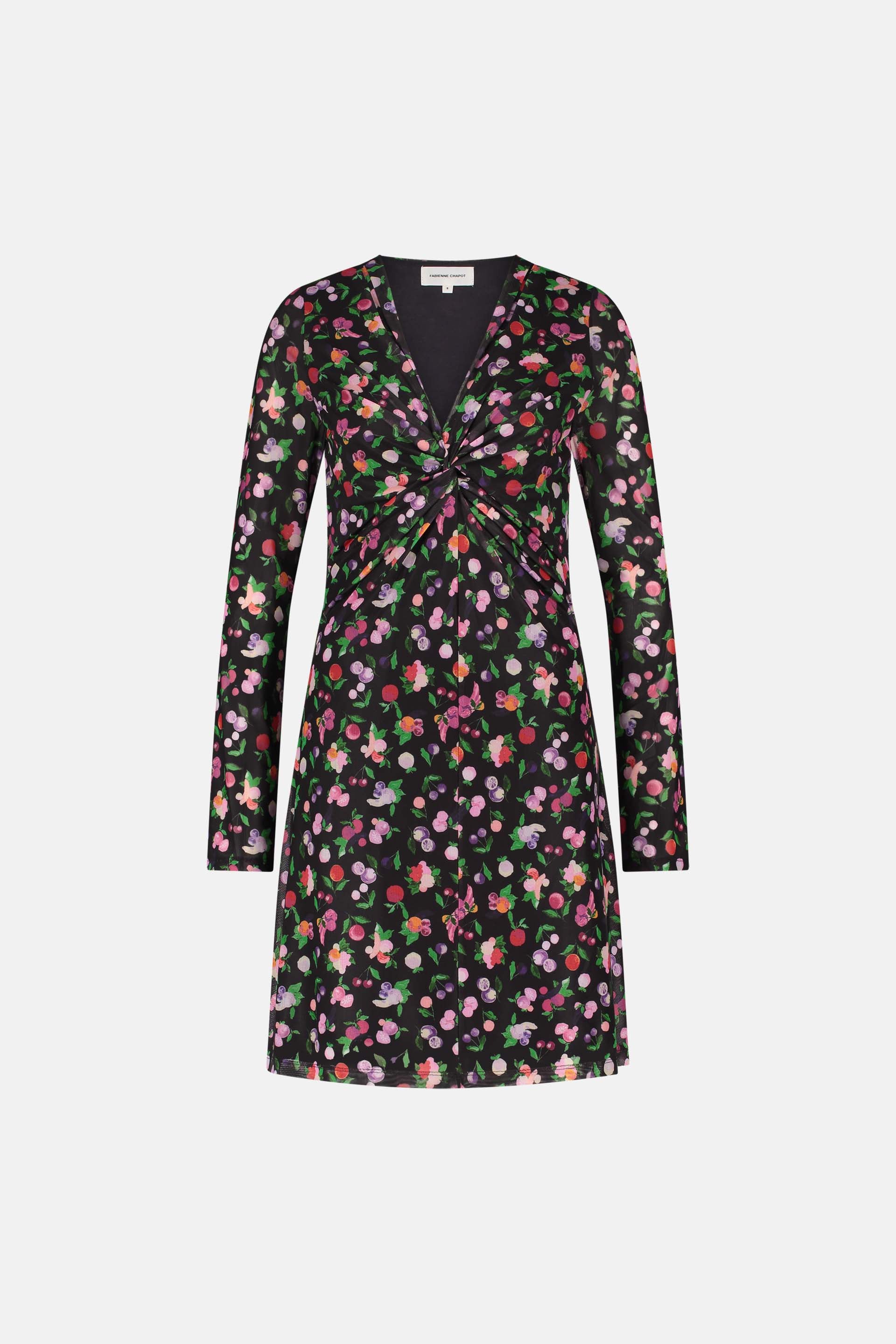 This women's midi dress in black features long sleeves, a scrunch in te front and a fruit print all-over. It is a feminine dress perfect for wearing day or night.