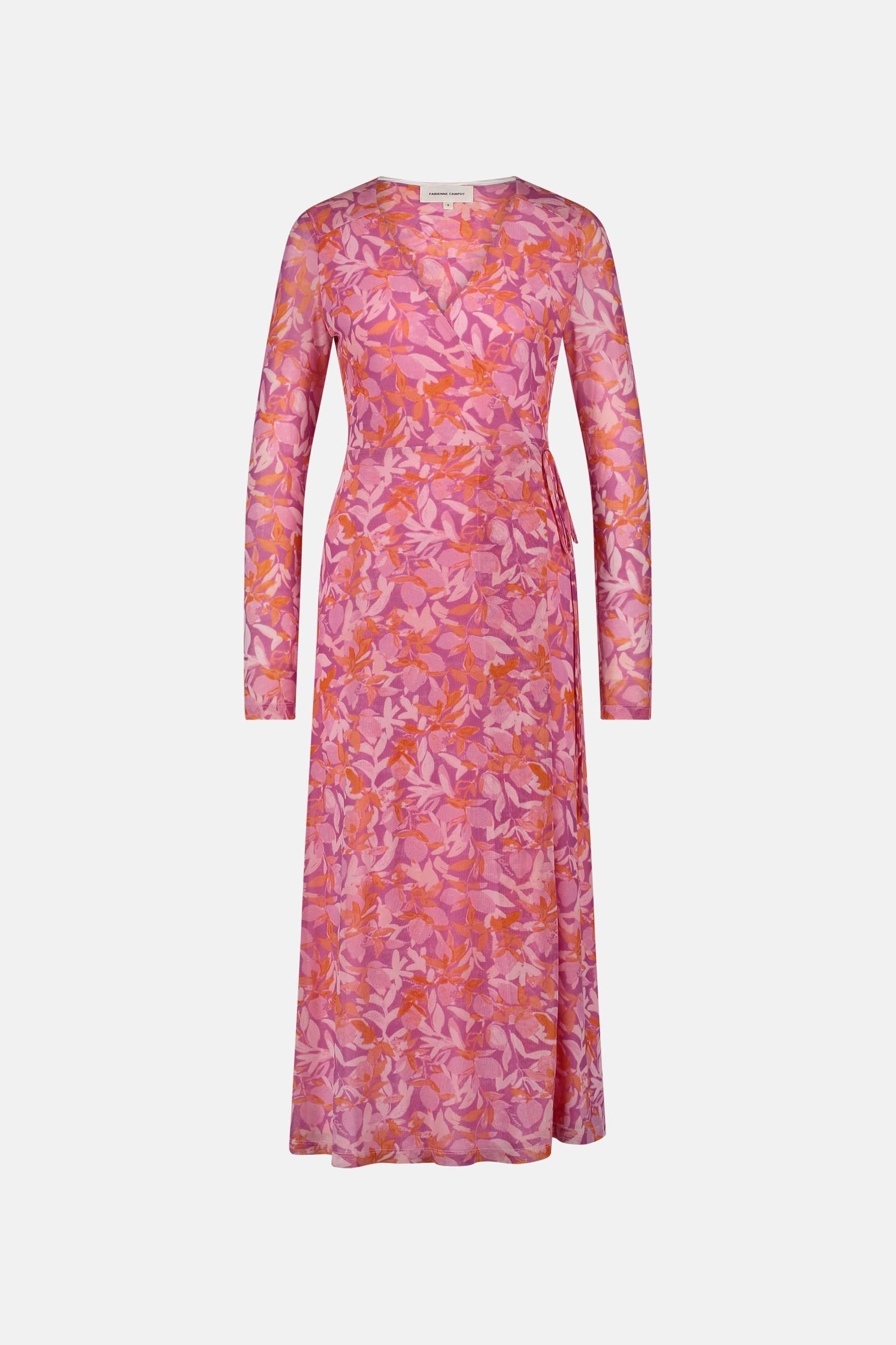 This long-sleeve wrap dress features a vibrant orange-pink floral print. Made from a recycled polyester blend, it offers a lightweight and flowy fit—perfect for a sunny day in the city or a summer party.