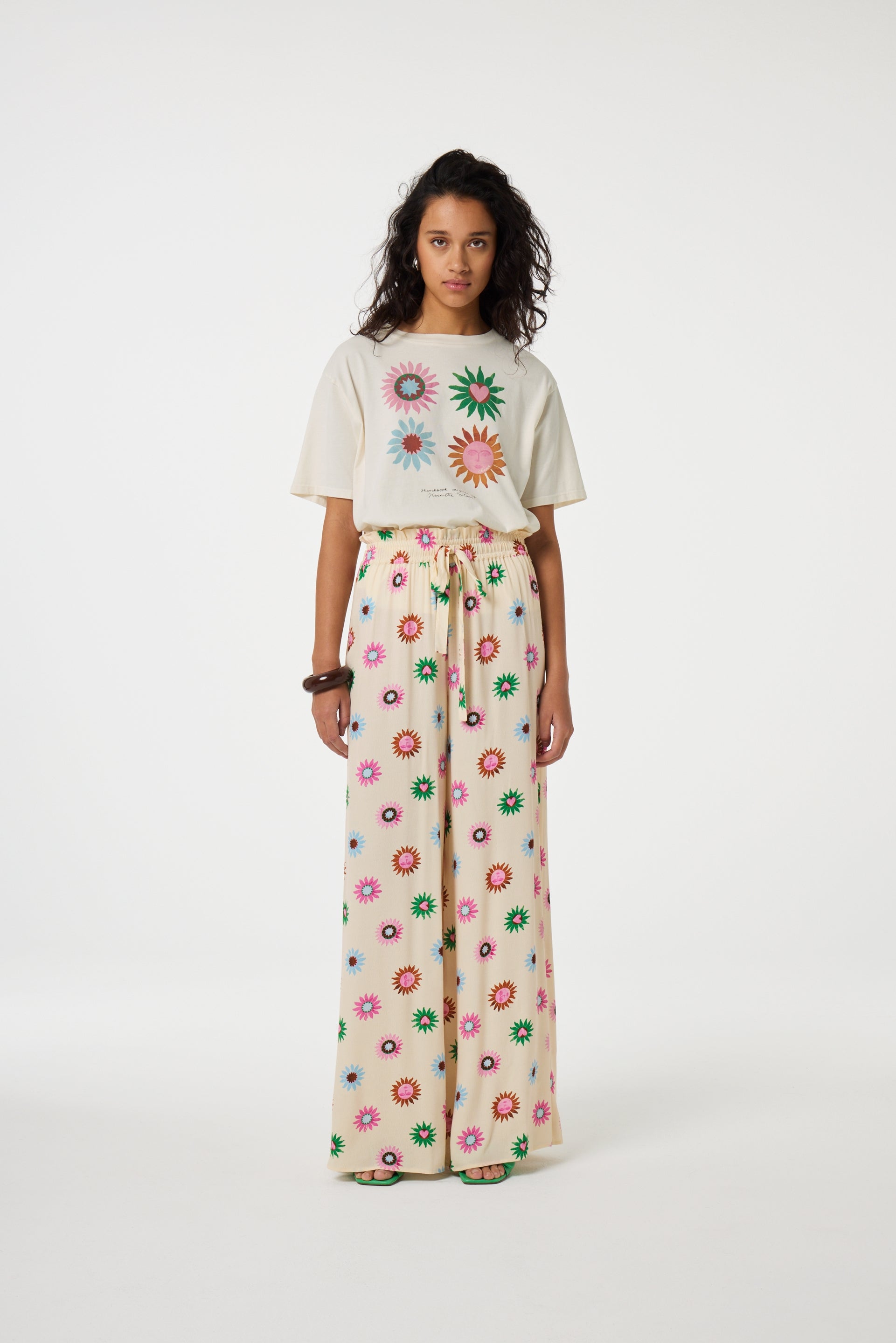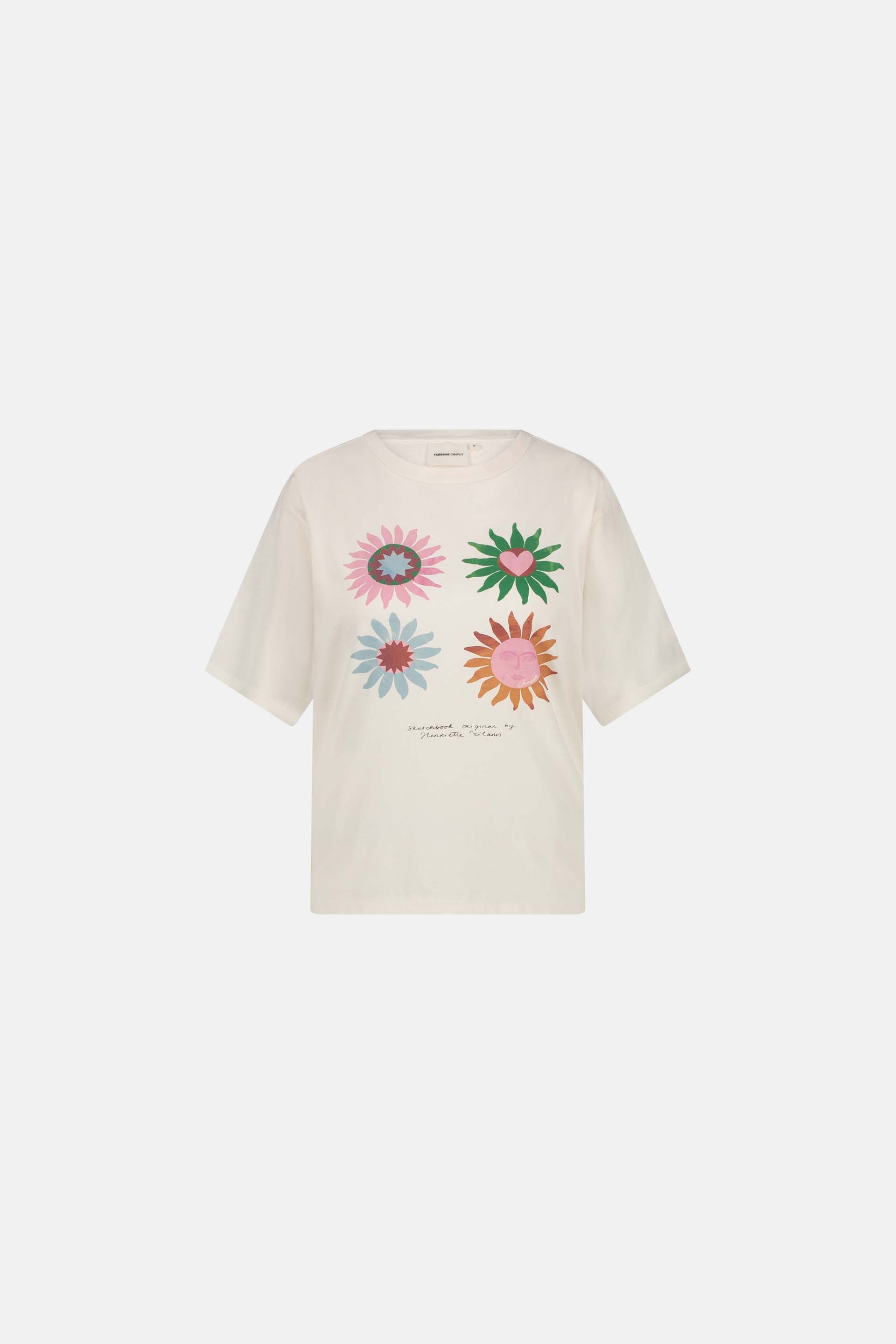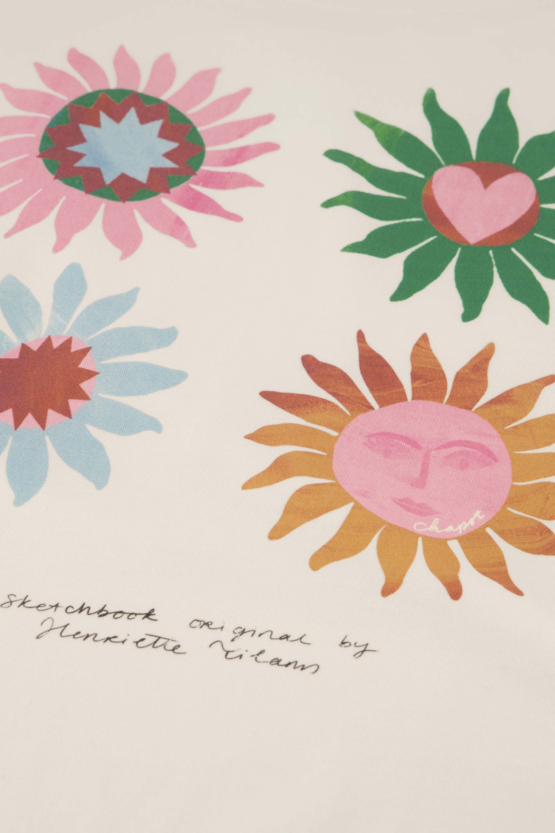 This white T-shirt, made from 100% cotton, features a bold sun print. It stands out while remaining a versatile staple, easy to combine with any outfit for a simple and playful look.