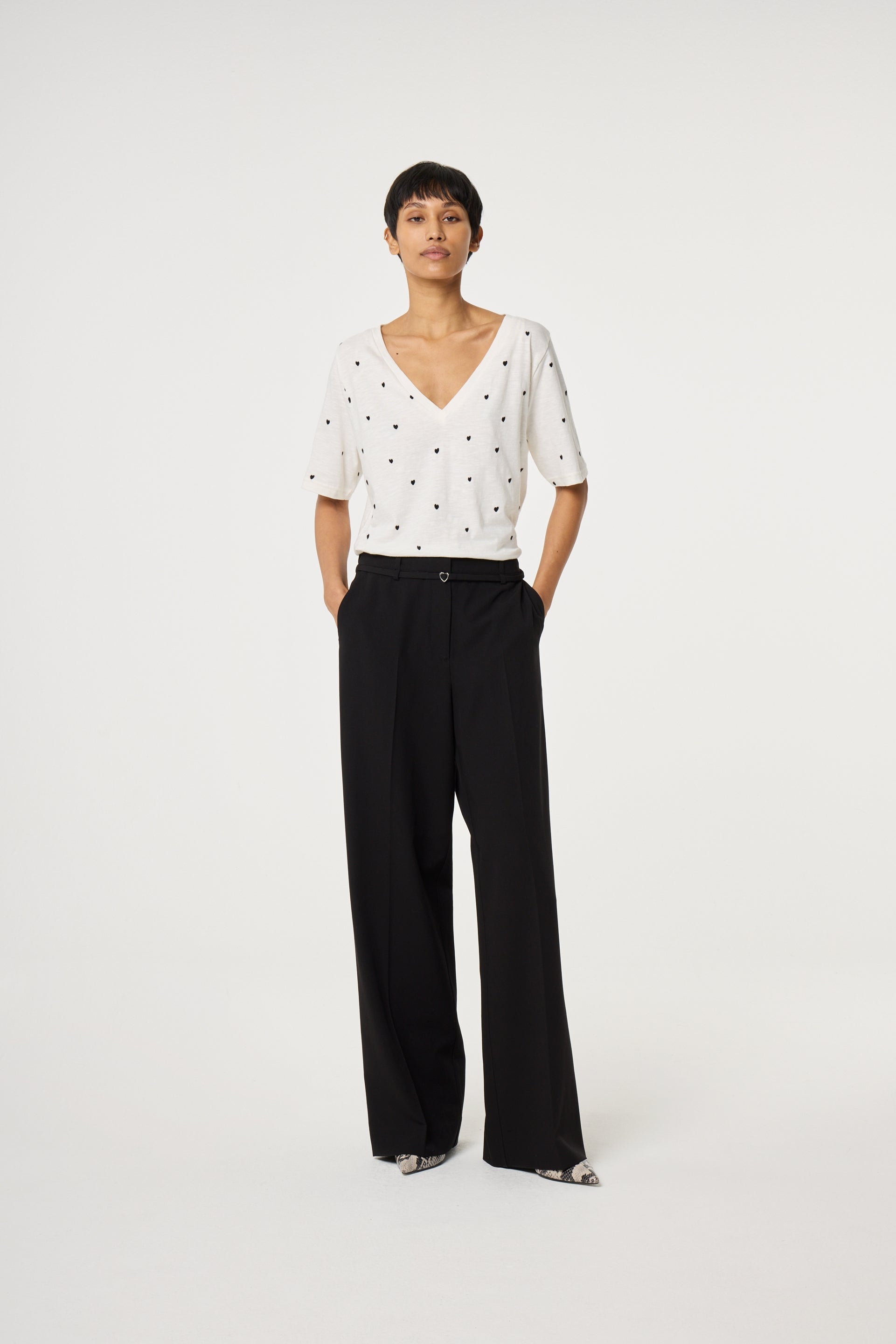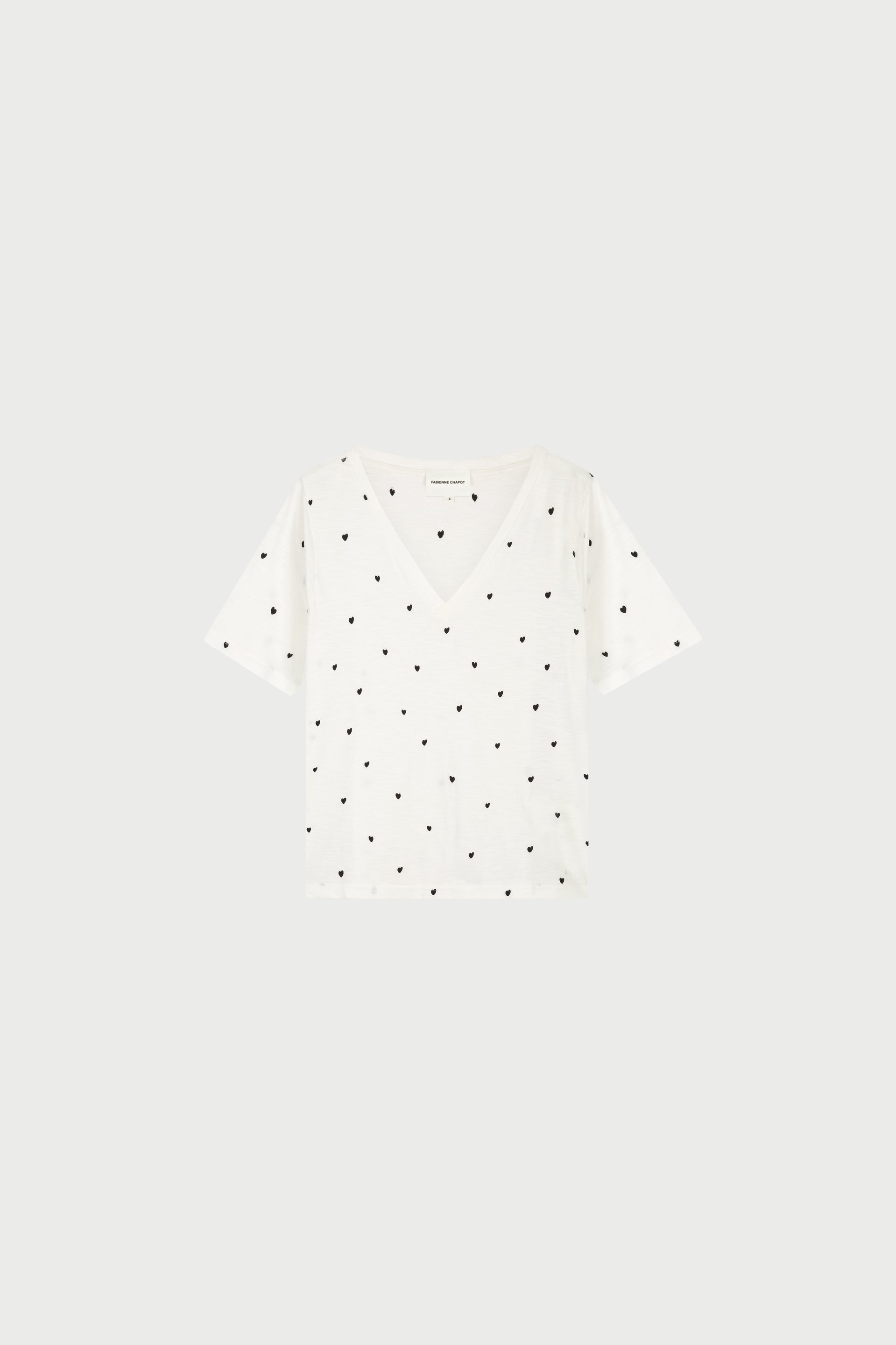 This white T-shirt is made from soft, breathable organic cotton and features a relaxed, comfortable fit and a flattering V-neck. The subtle black heart print scattered across the fabric adds a playful yet refined touch, making it an easy statement piece for everyday wear.