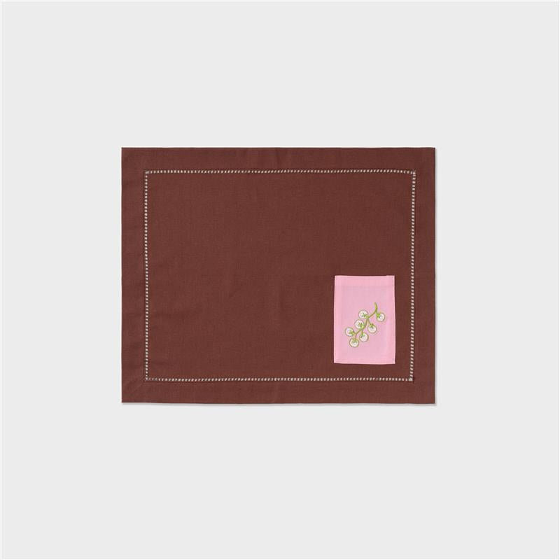 Das Set besteht aus einem tiefbraunen und einem zartrosa Platzset, beide aus hochwertigem Leinen gefertigt und mit einem eleganten Hohlsaum versehen. Jedes Platzset hat eine Bestecktasche in einer kontrastierenden Farbe, fein bestickt mit einem leuchtenden Tomatenmotiv, eine verspielte Anspielung auf die Freude des Beisammenseins und eine Hommage an die Mode.