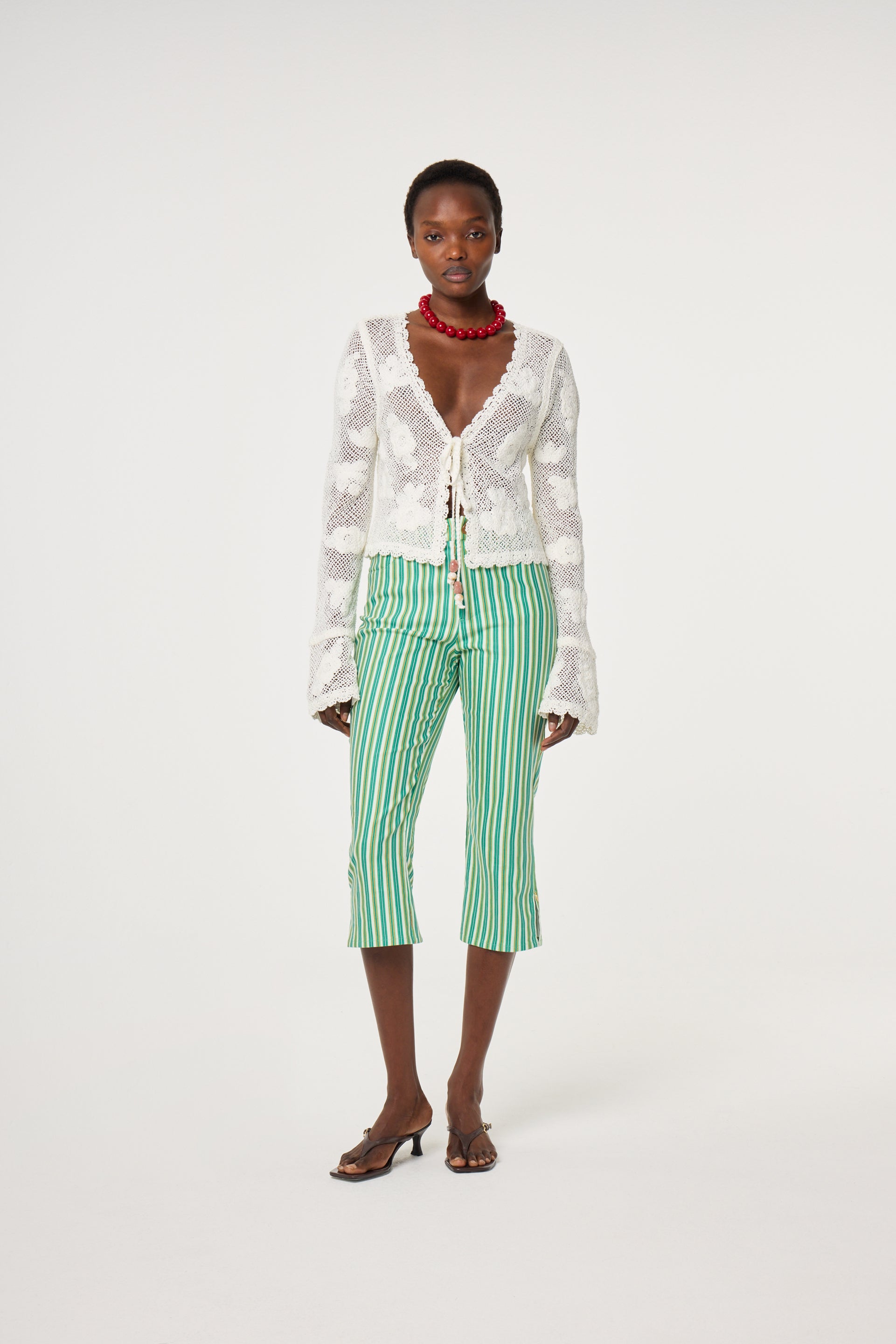 Diese farbenfrohe Streifenhose ist eine tolle Wahl für den Frühling. Der strukturierte Stoff und der klassische Knopfverschluss sorgen für eine bequeme und zugleich elegante Passform, die eine moderne und schmeichelhafte Silhouette zaubert. Für einen raffinierten Look kombinieren Sie die Hose mit einem schicken Neckholder-Top und runden Sie das Outfit mit eleganten Kitten Heels ab – für zeitlose Weiblichkeit.