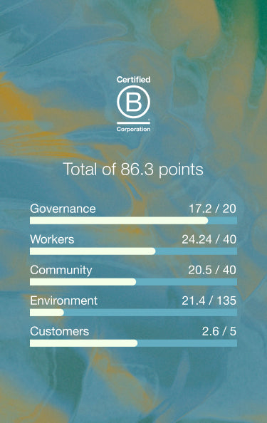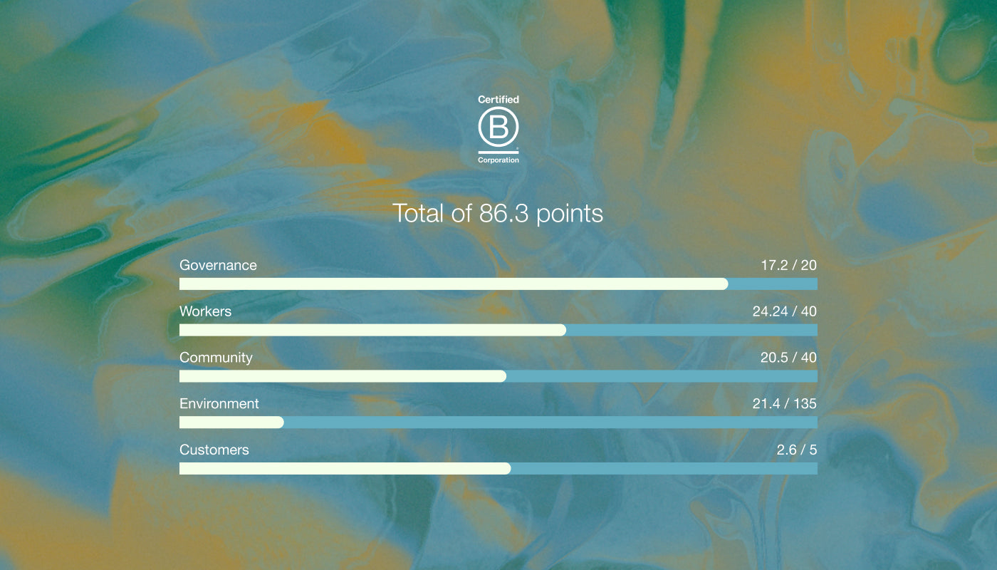 Unternehmen unterziehen sich einer gründlichen Bewertung durch B Lab, eine Organisation, die sich der Umgestaltung der Wirtschaft zum Nutzen der Gesellschaft und des Planeten verschrieben hat. Wir müssen mindestens 80 von 200 Punkten erreichen und müssen vollständig transparent sein.