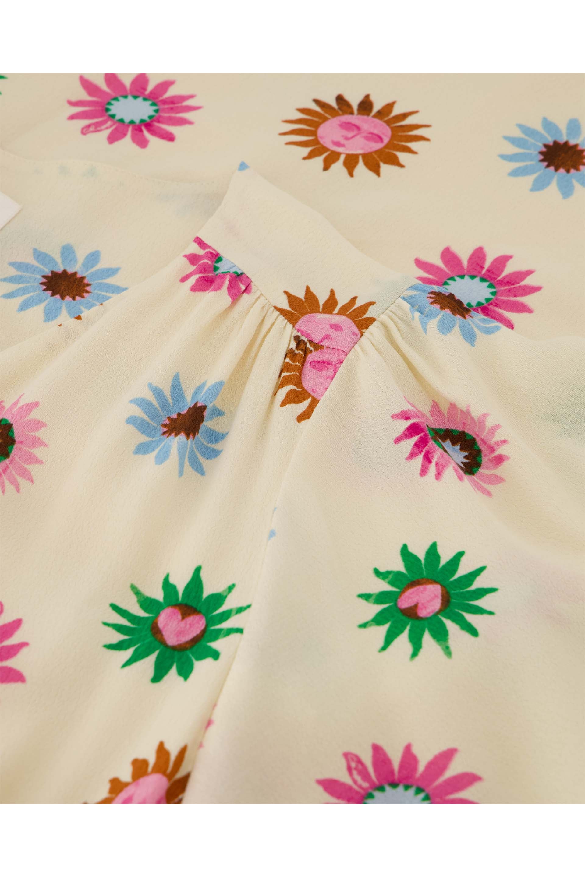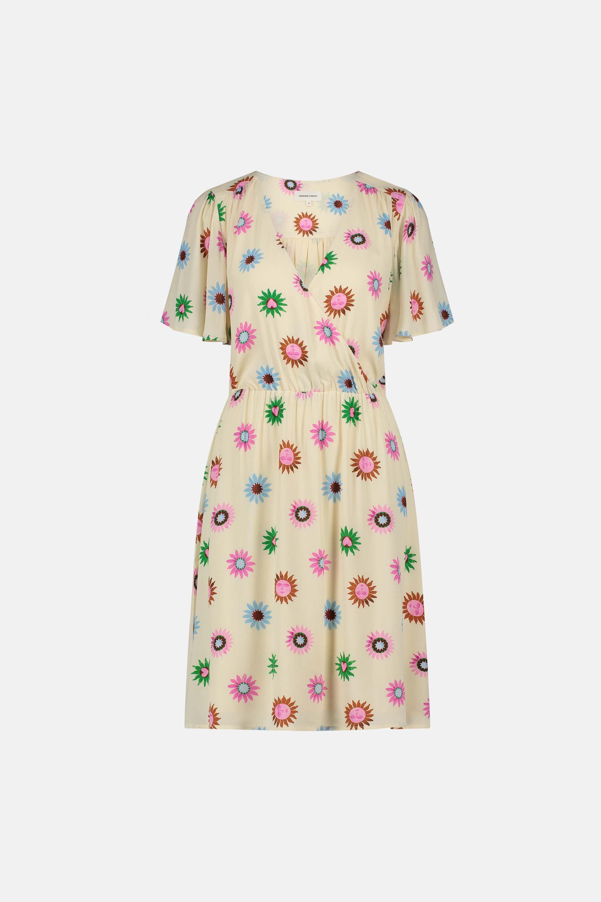 Dieses fließende Kleid verfügt über einen durchgehenden Sonnenprint, einen dezenten V-Ausschnitt und kurze Ärmel. Die taillierte Passform sorgt für eine schmeichelhafte Silhouette und macht es zur perfekten Wahl für einen mühelosen, alltäglichen Stil.