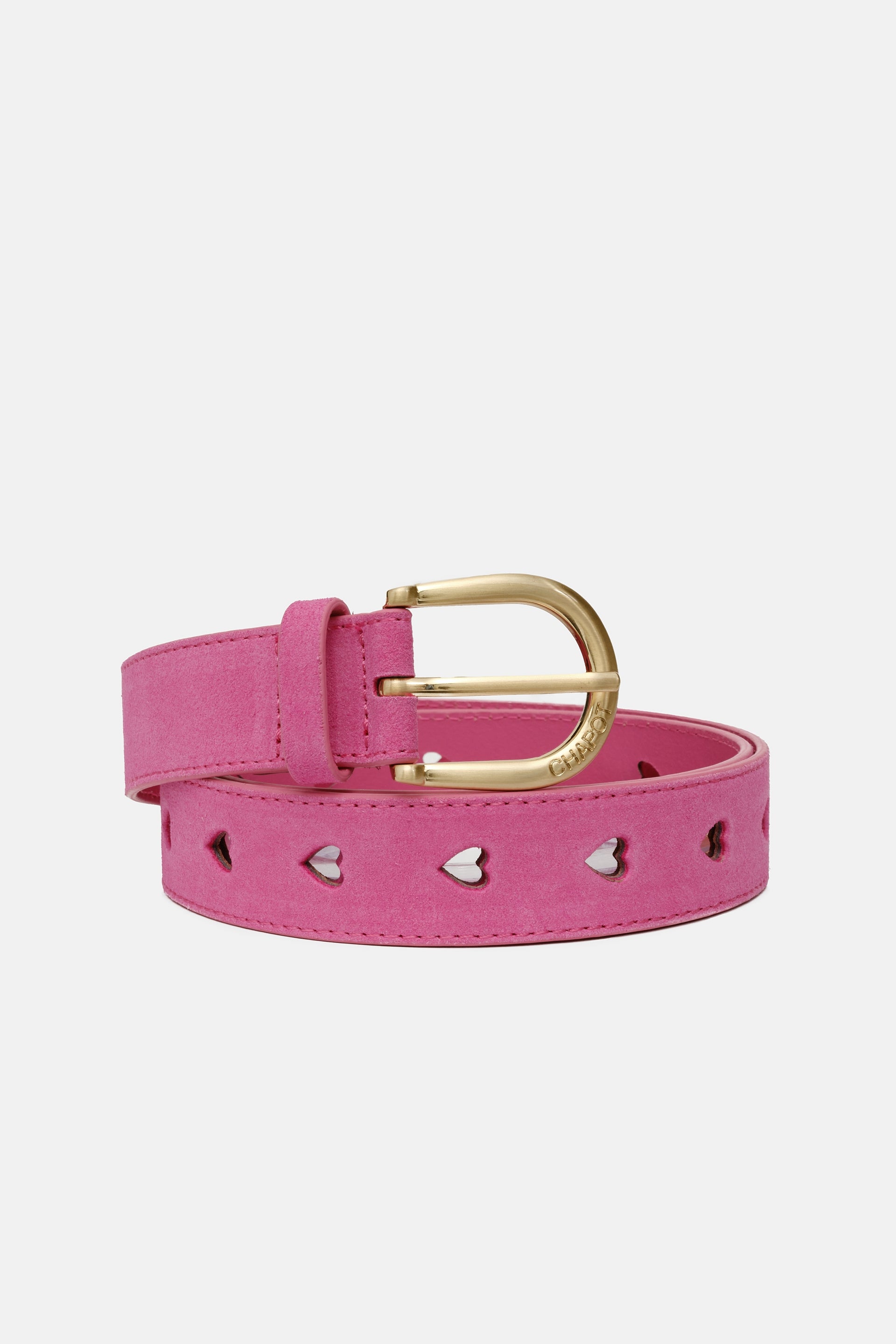 Rosafarbener Gürtel mit goldener, runder Schnalle. Der Cut It Out Heart Belt ist aus 100 % Leder gefertigt und mit ausgeschnittenen Herzen auf der gesamten Länge versehen.