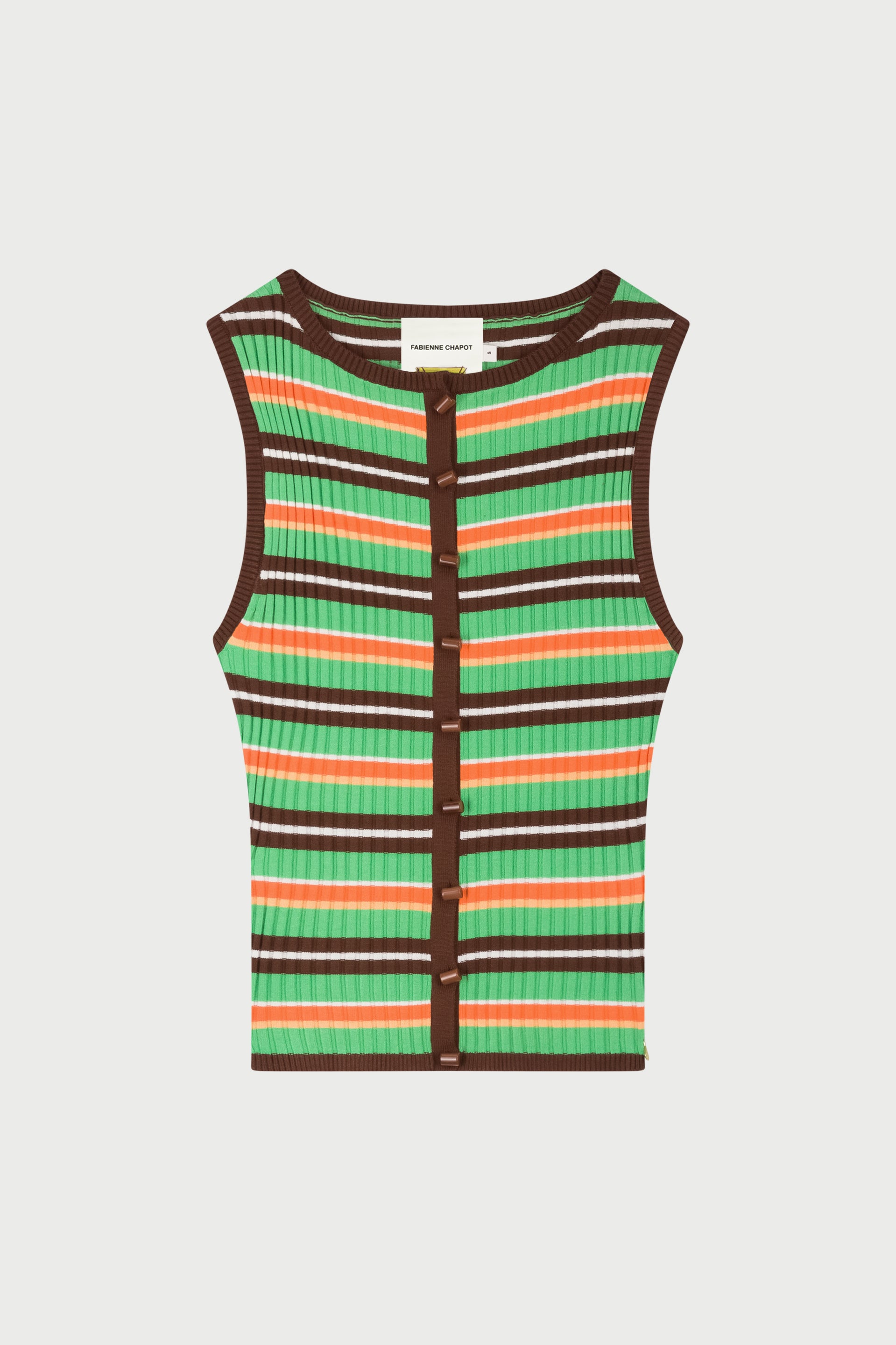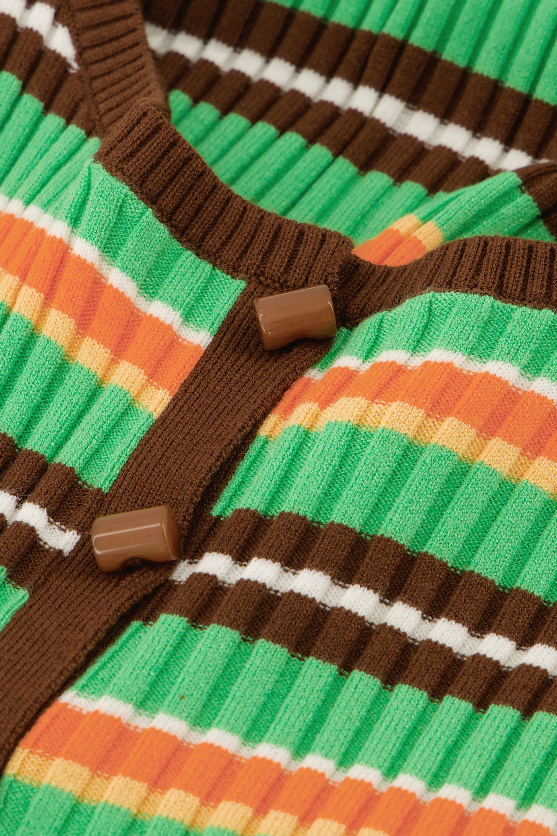 Diese farbenfrohe, gestreifte, ärmellose Strickjacke ist die perfekte Wahl für sonnige Tage. Das gerippte Strickmaterial fühlt sich weich an und die schmale, schmeichelhafte Passform mit klassischer Knopfleiste sorgt für einen eleganten Look. Tragen Sie sie solo für einen modernen Auftritt oder kombinieren Sie sie mit einer schicken Bluse für ein fröhliches Outfit.