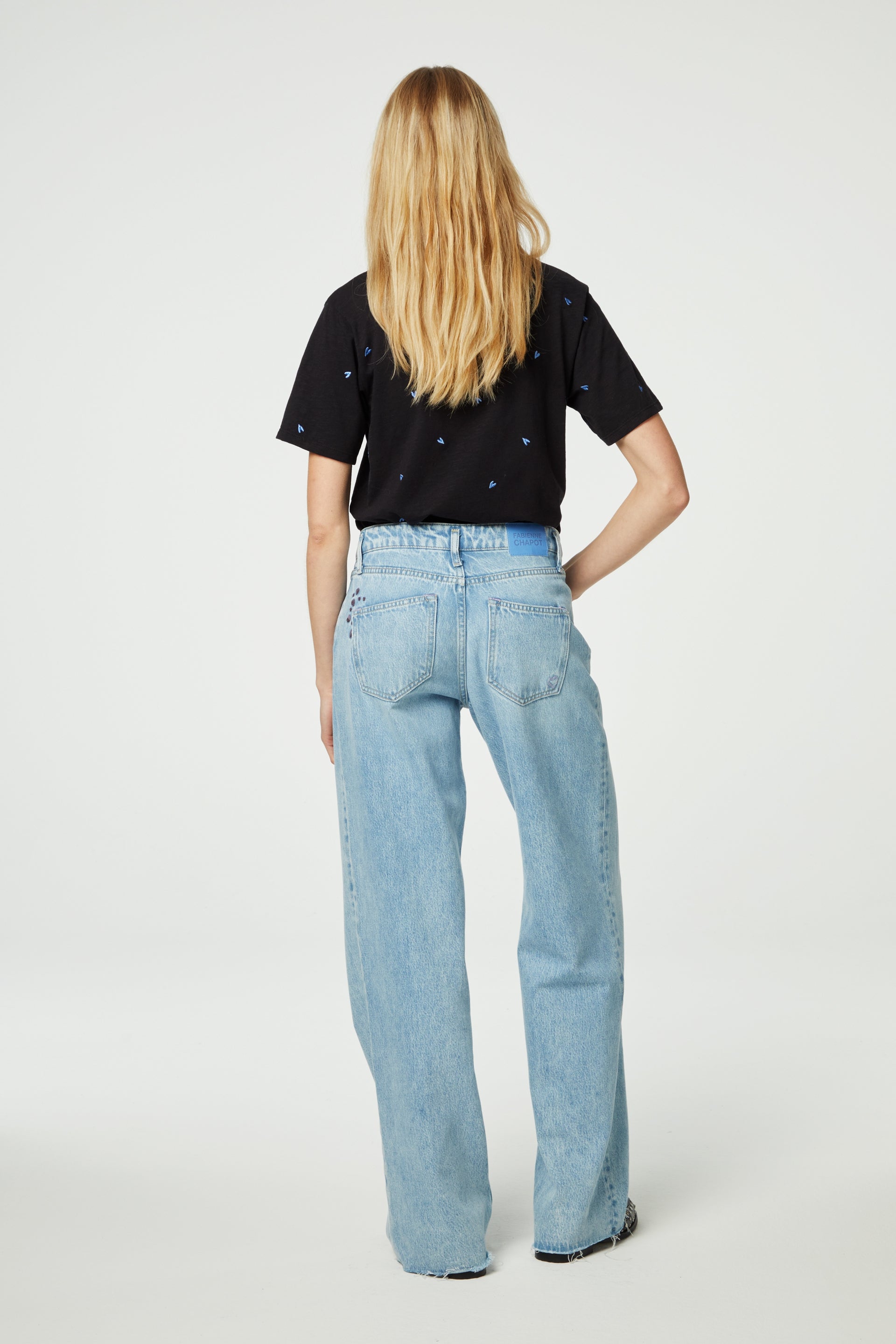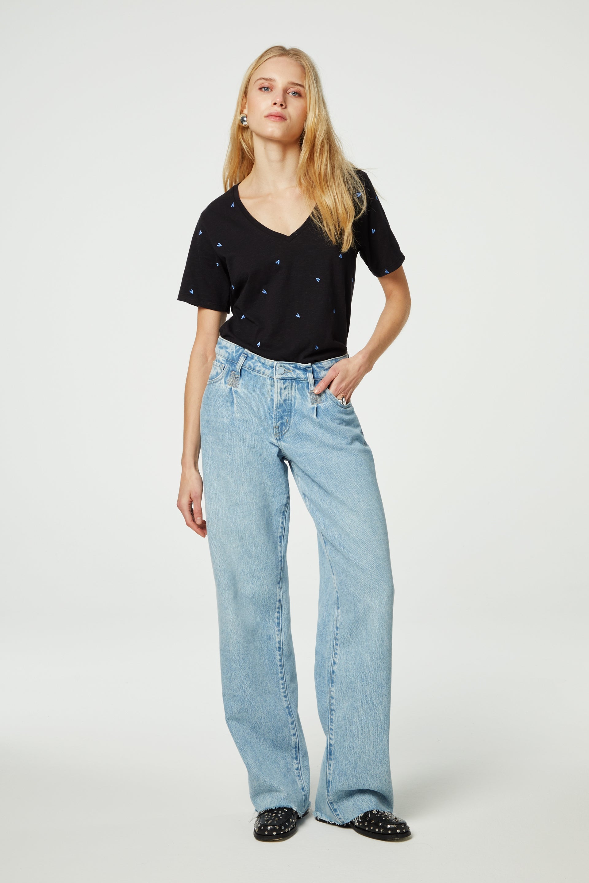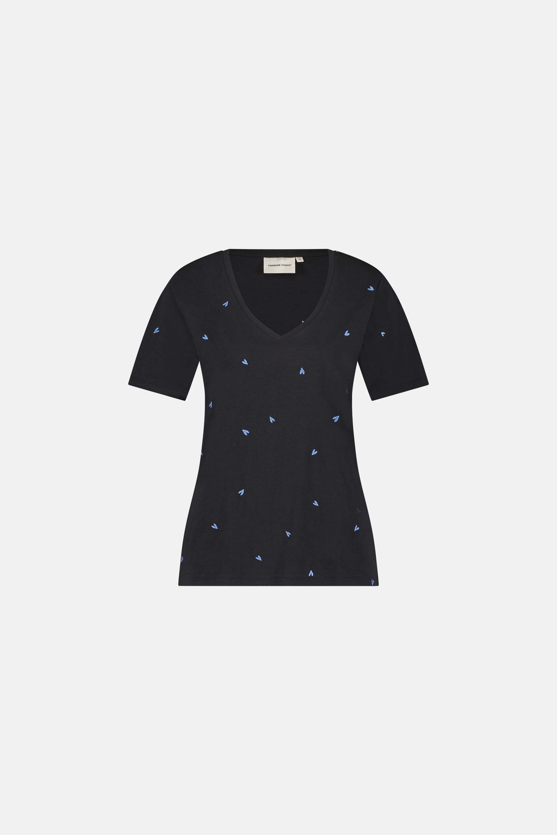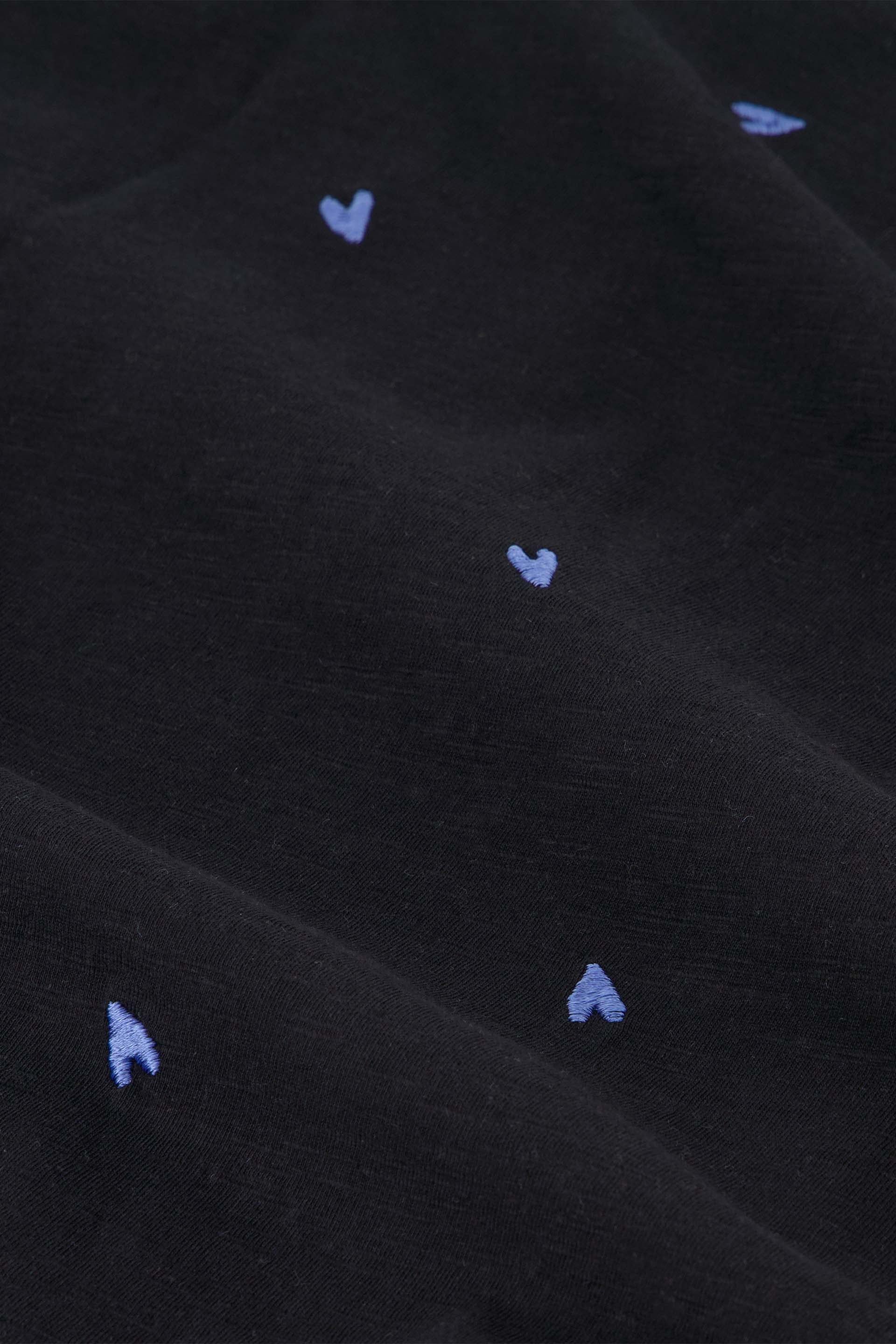 Schwarzes T-Shirt mit Rundhalsausschnitt und kurzen Ärmeln. Das Phil V-neck Heart T-Shirt ist mit einer „Herz“-Alloverstickerei versehen und besteht aus 100 % Bio-Baumwolle: weich, bequem und nachhaltig.