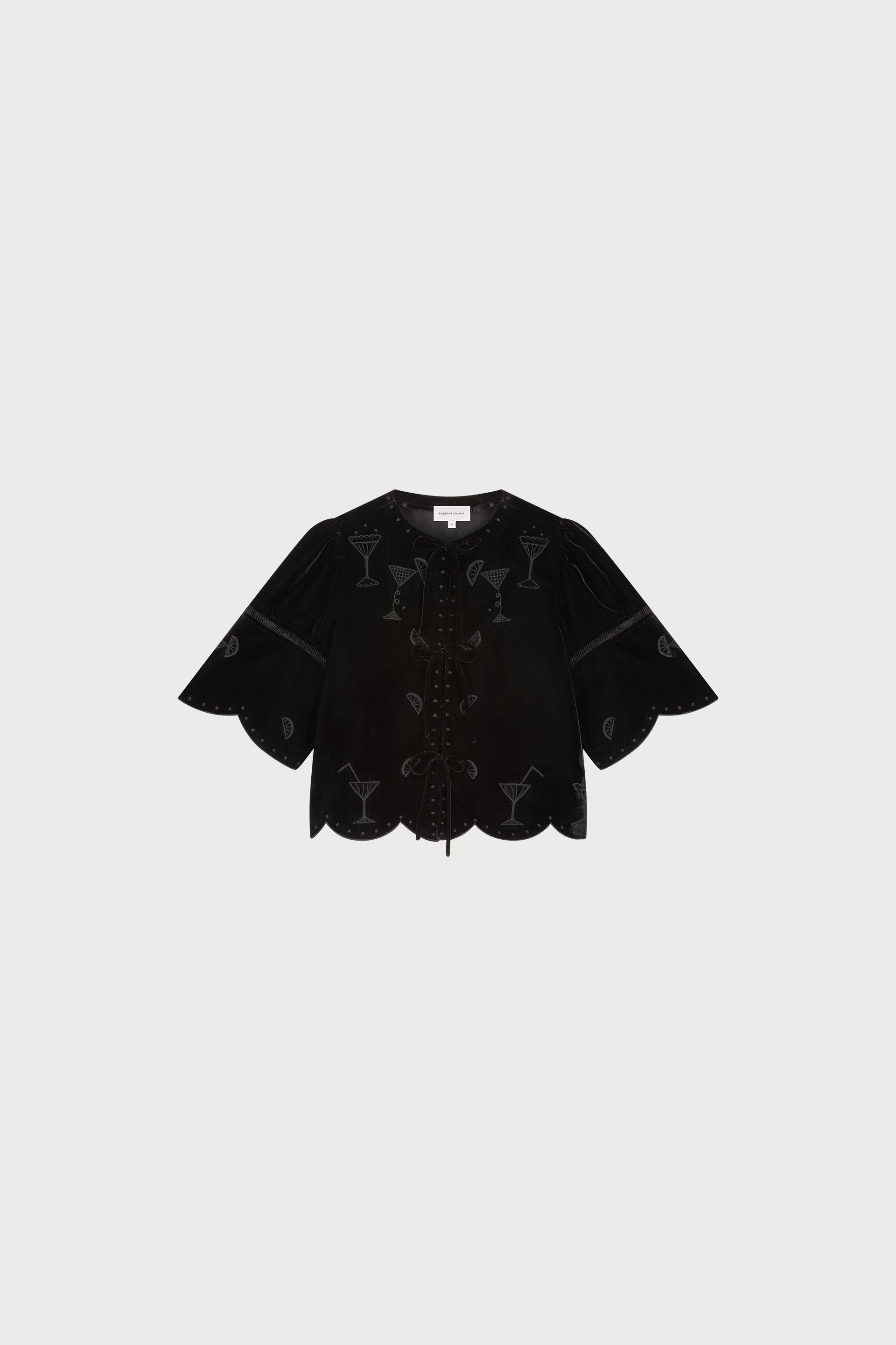 Diese schwarze Bluse aus 100 % Polyester ist mit verspielten, gestickten Cocktailglas-Motiven verziert. Mit weiten, ausgestellten Ärmeln und entspannter Passform bringt sie Spaß und zugleich Eleganz in jedes Outfit. Leicht und vielseitig kombinierbar – perfekt zu Röcken, Hosen oder Jeans für lässige Looks ebenso wie für festliche Gelegenheiten.