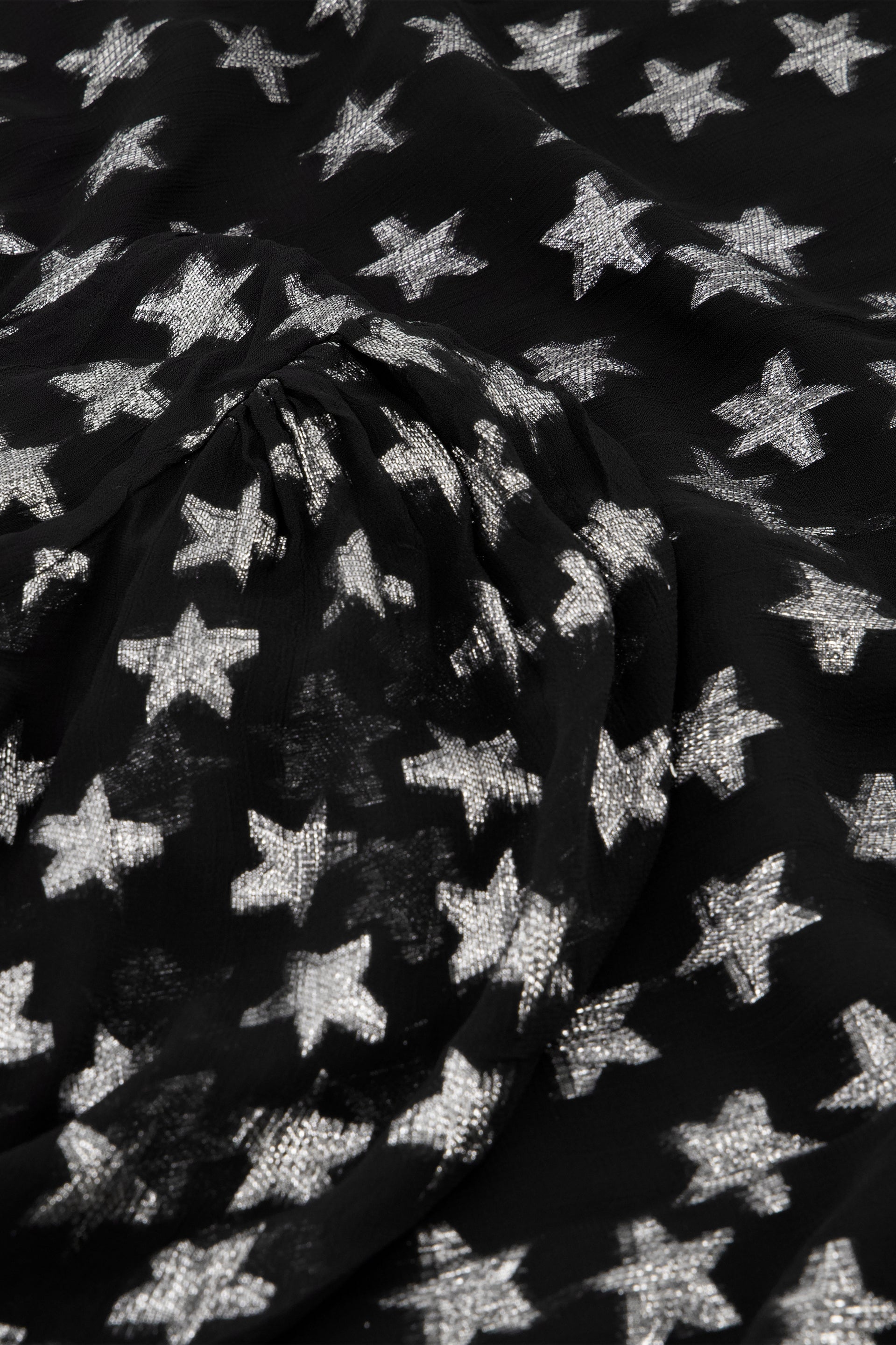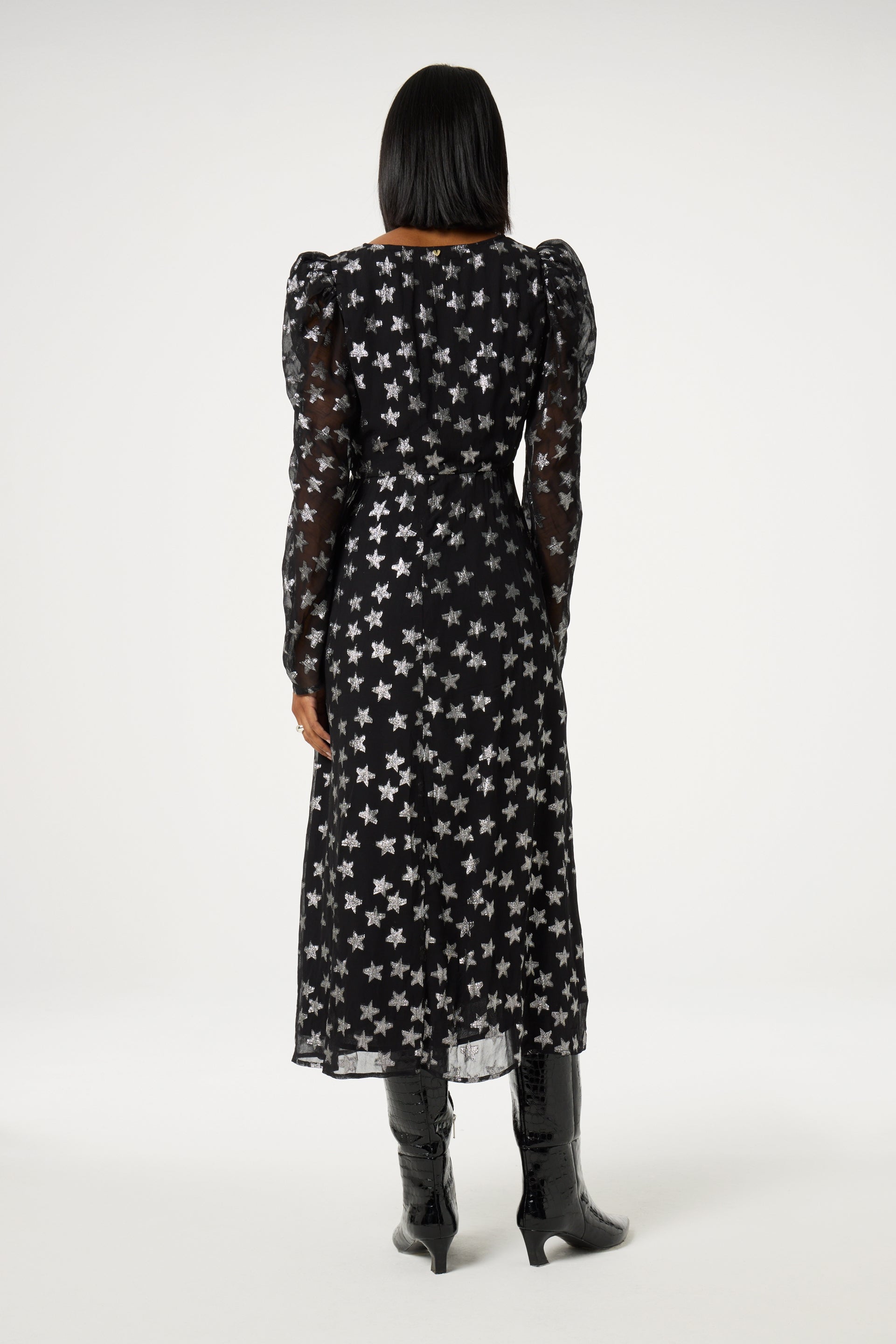 Dieses schwarze Midi-Damenkleid hat lange Ärmel, einen elastischen Taillenbund und Manschetten sowie einen Druck mit silbernen Sternen, der Ihrem Look eine feminine Note verleiht.