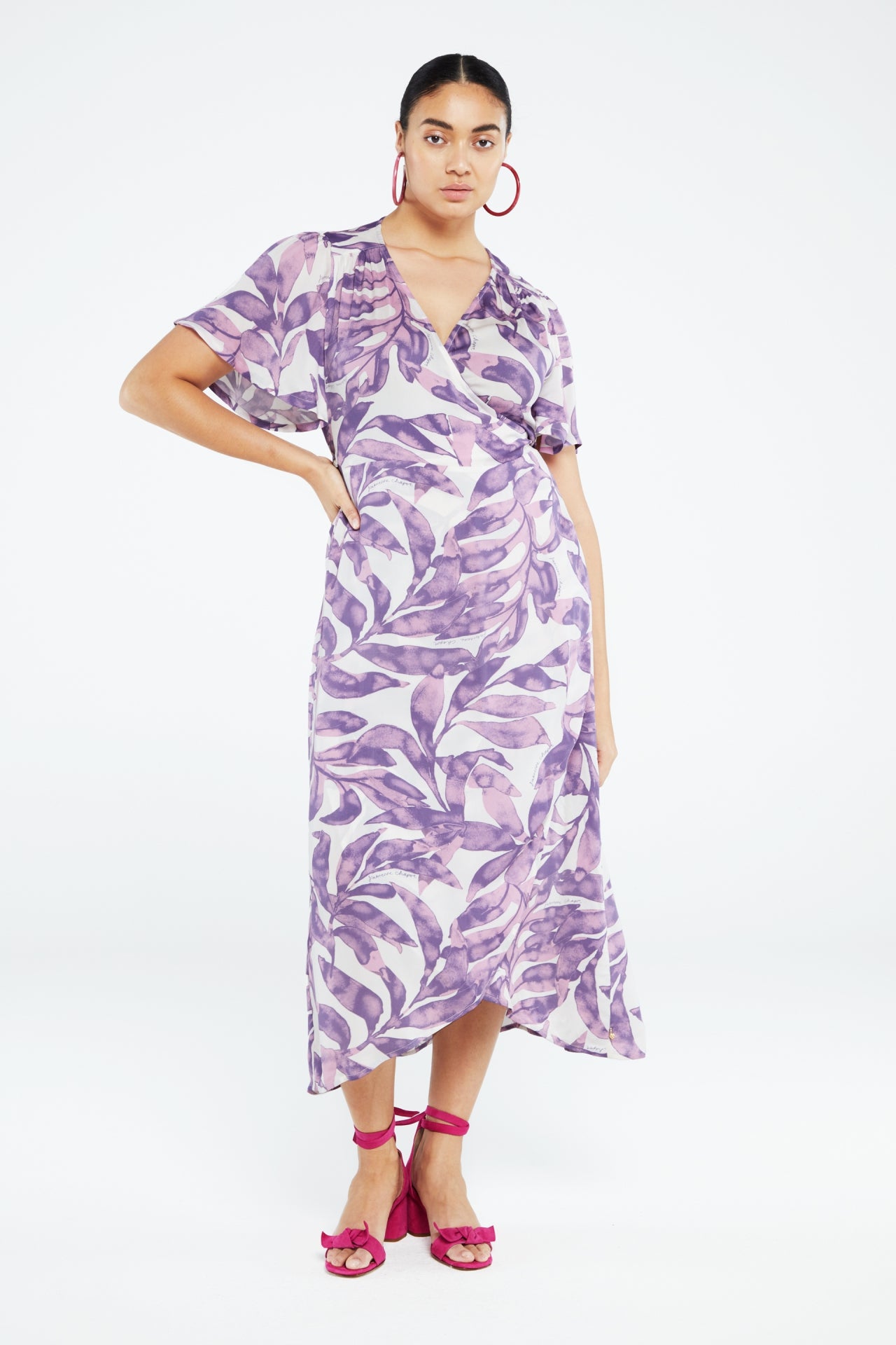 Midi overslagjurk met strikceintuur in de taille en een korte vlindermouw. Archana Butterfly Dress heeft een all over Leaf Deluxe print. Dit item is gemaakt van 54% LENZING™ ECOVERO™ Viscose: luchtig, soepel en duurzaam. LENZING™ en ECOVERO™ zijn handelsmerken van Lenzing AG.