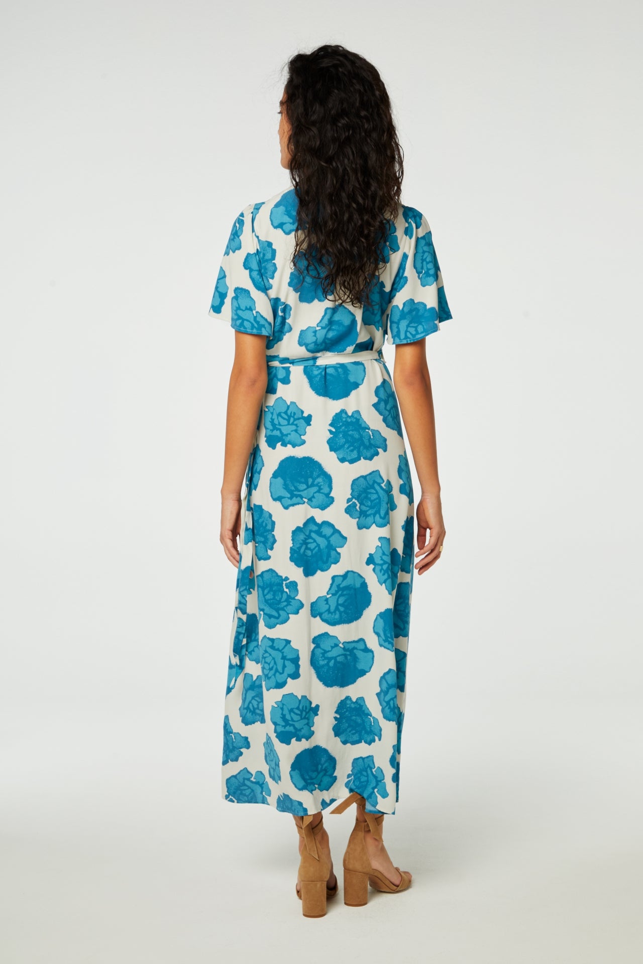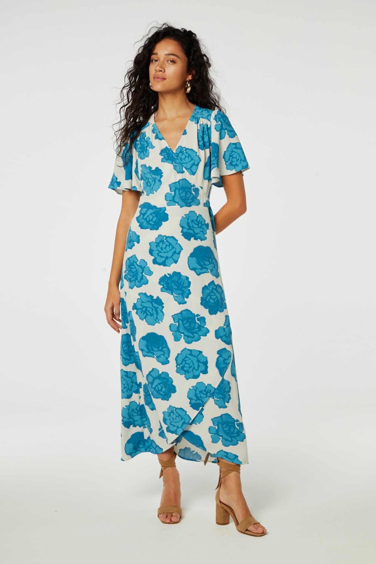 Midi overslagjurk met strikceintuur in de taille en een korte vlindermouw. Archana Butterfly Dress heeft een all over 'Madame De' print en de jurk valt aan de achterzijde langer dan de voorzijde.