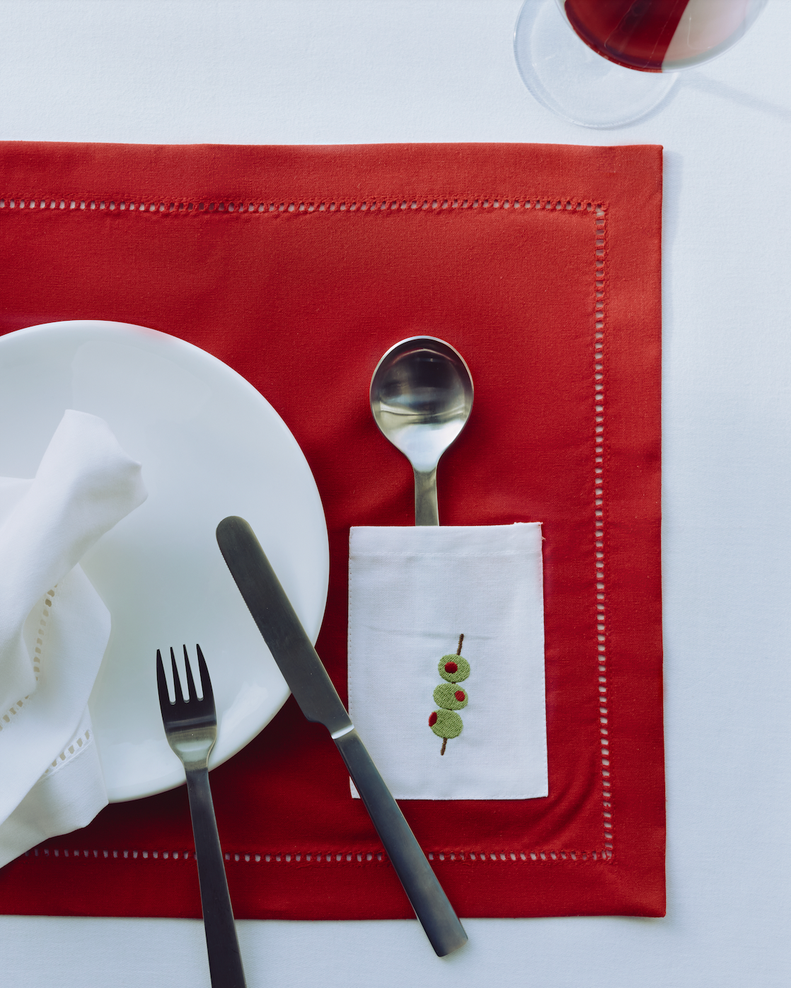 Gemaakt van hoogwaardig linnen en afgewerkt met een elegante ajourrand, bestaat de set uit felrode placemats met frisse witte bestekvakken, subtiel geborduurd met een olijf-op-prikkermotief – een speelse knipoog naar je favoriete martini.