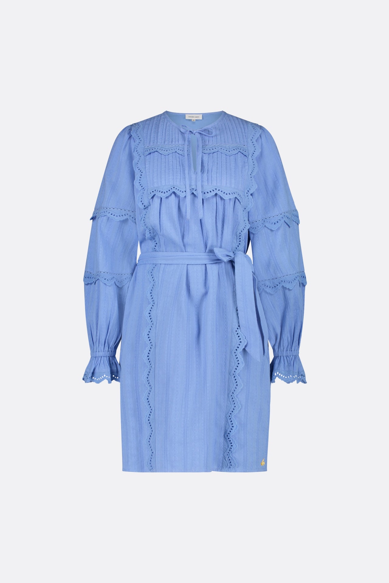 Korte blauwe jurk met lange mouwen, strikceintuur en V hals met strikdetail. Jeanine Dress heeft prachtige opengewerkte details en elastiek bij de manchetten. Deze jurk is gemaakt van 100% katoen.