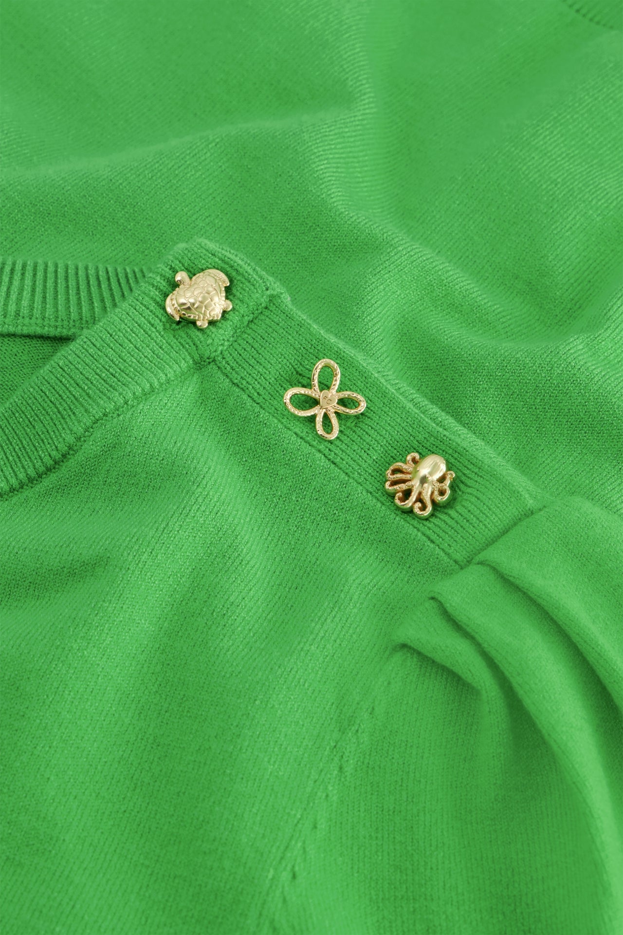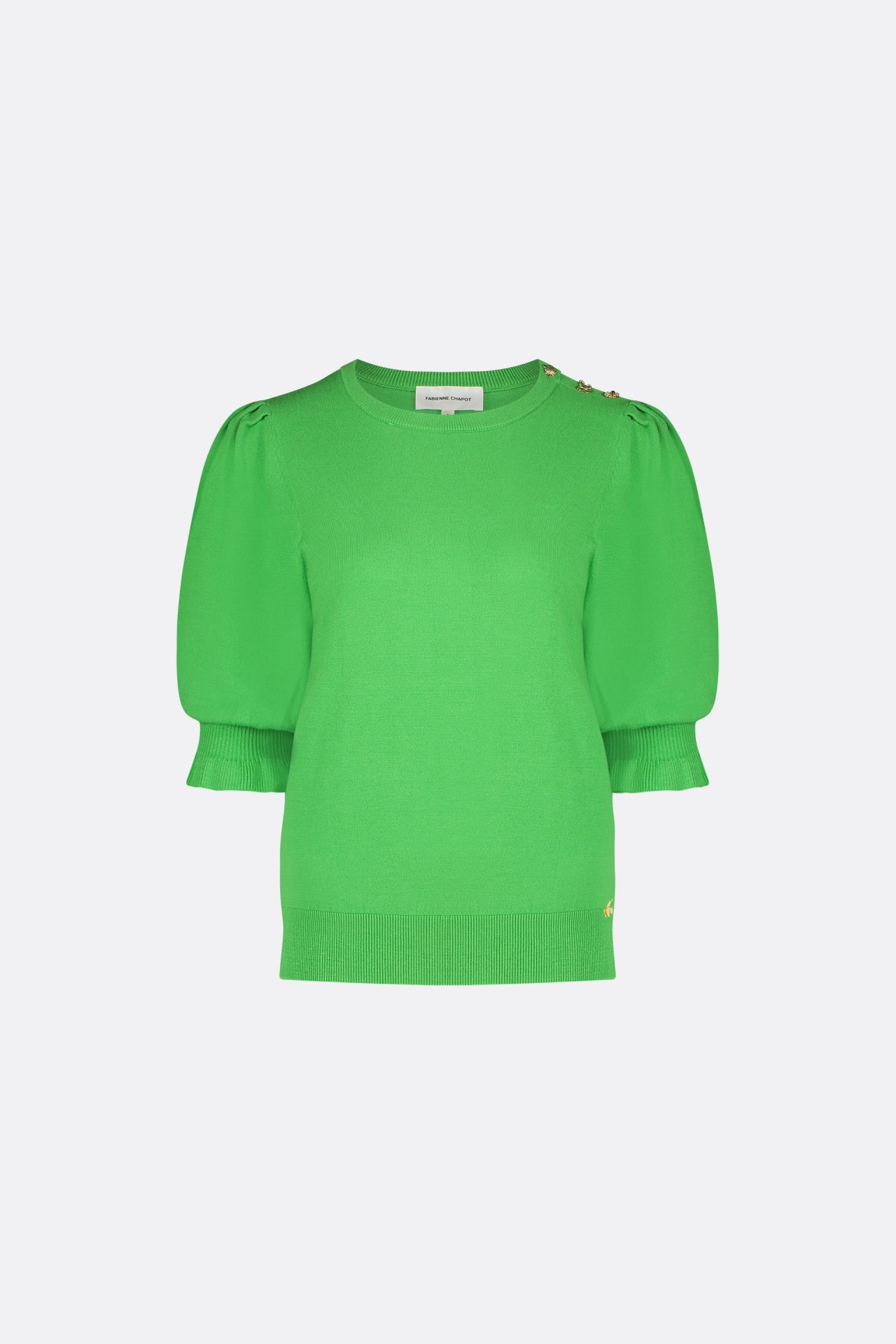 Fijngebreide groene trui met ronde hals en driekwart pofmouwen met ruffle. Jolly Pullover heeft drie fancy signature knopen op de linkerschouder.