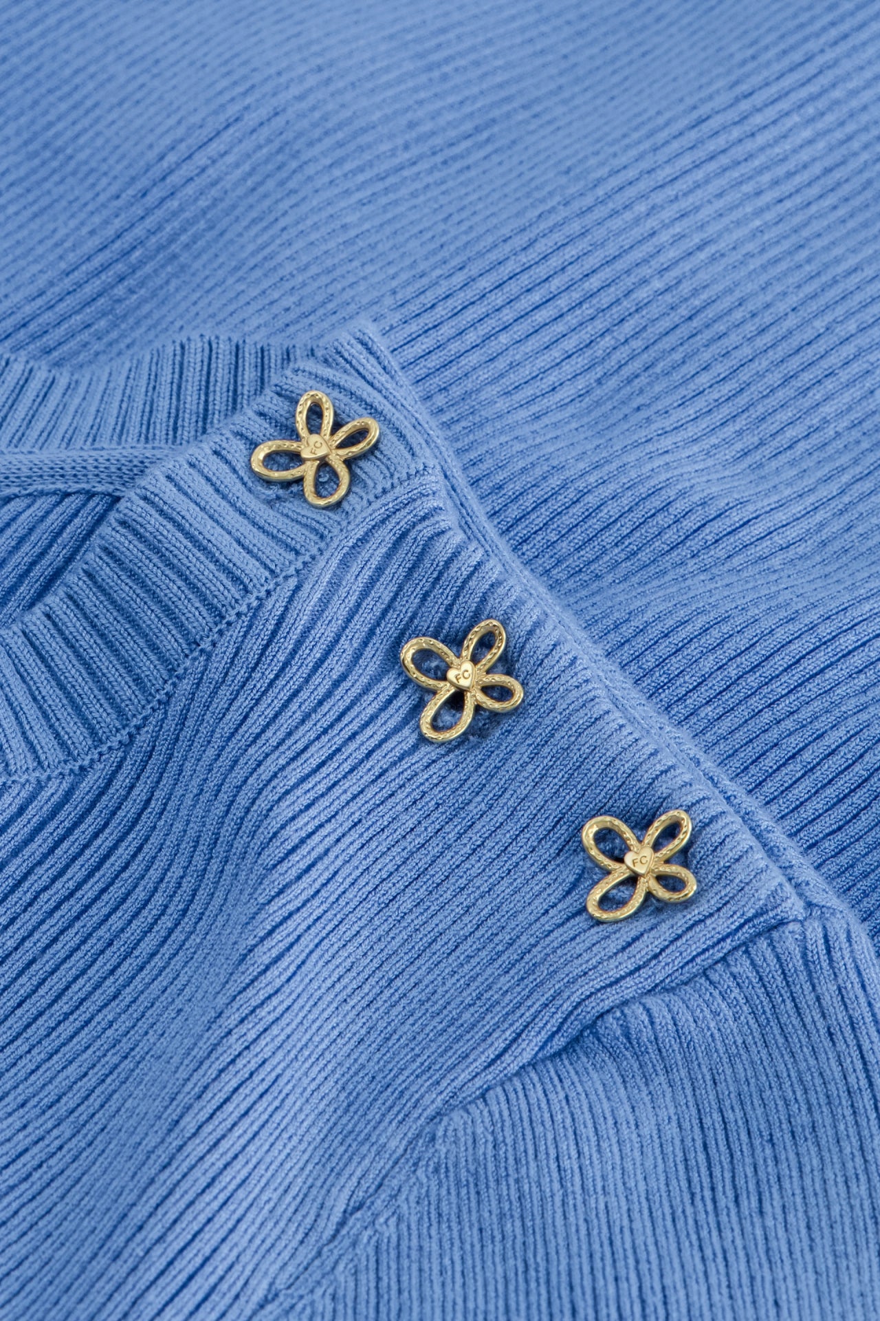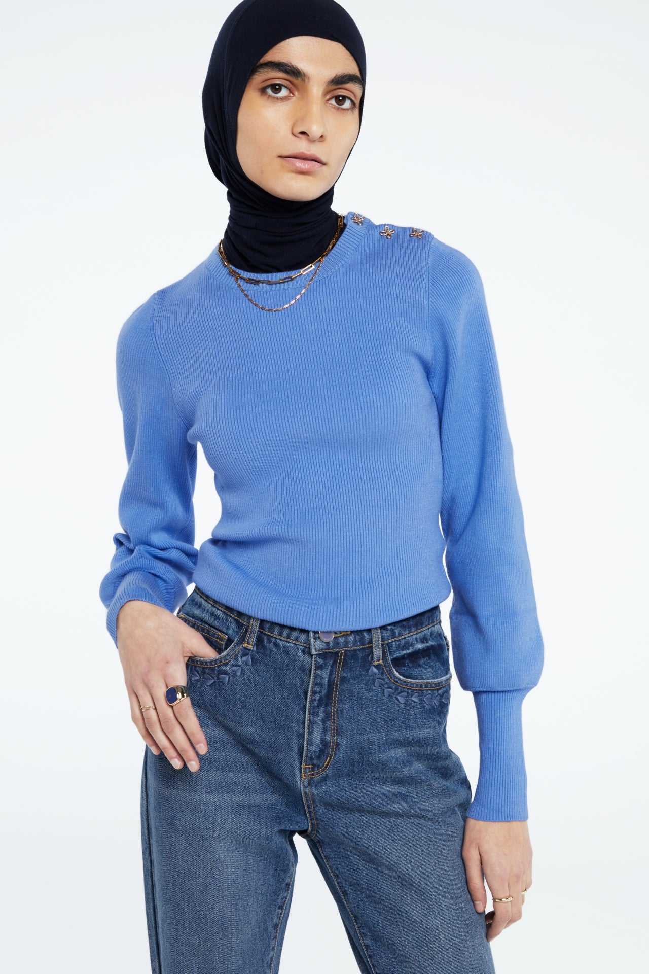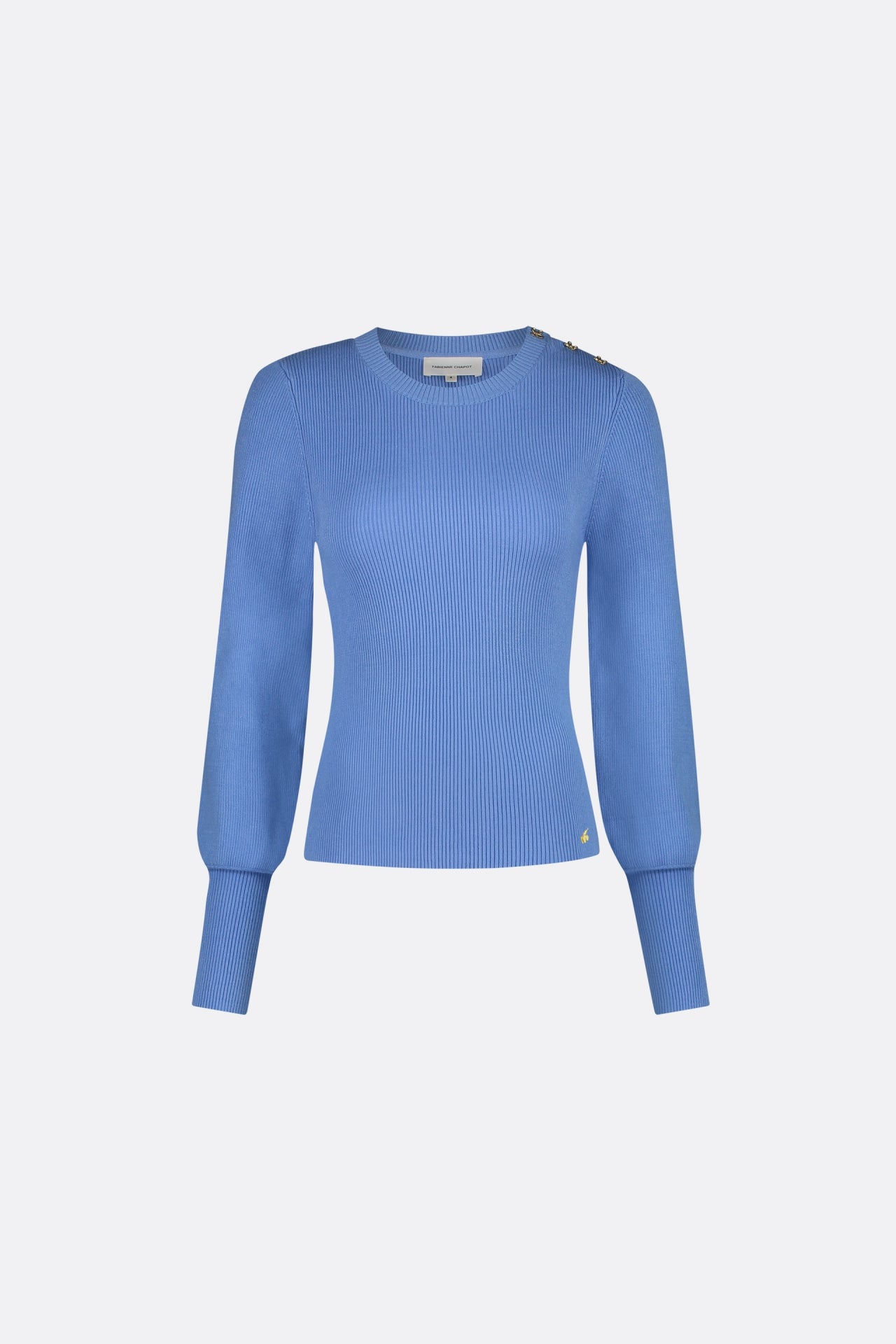 Blauwe trui met ronde hals en lichte ballonmouwen met lange manchetten. Lillian Pullover heeft drie speciaal gemaakte Fabienne Chapot knopen op de linkerschouder.