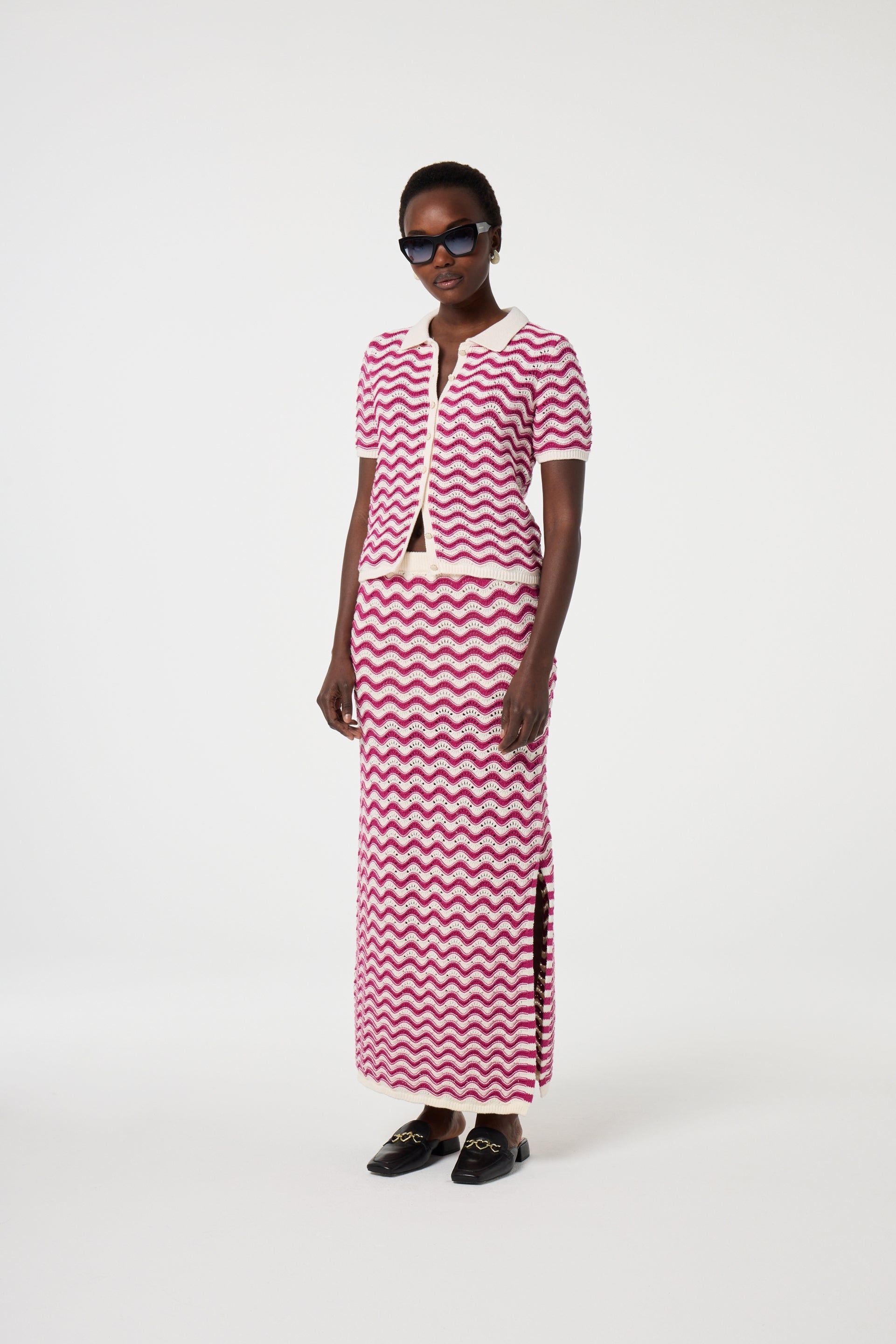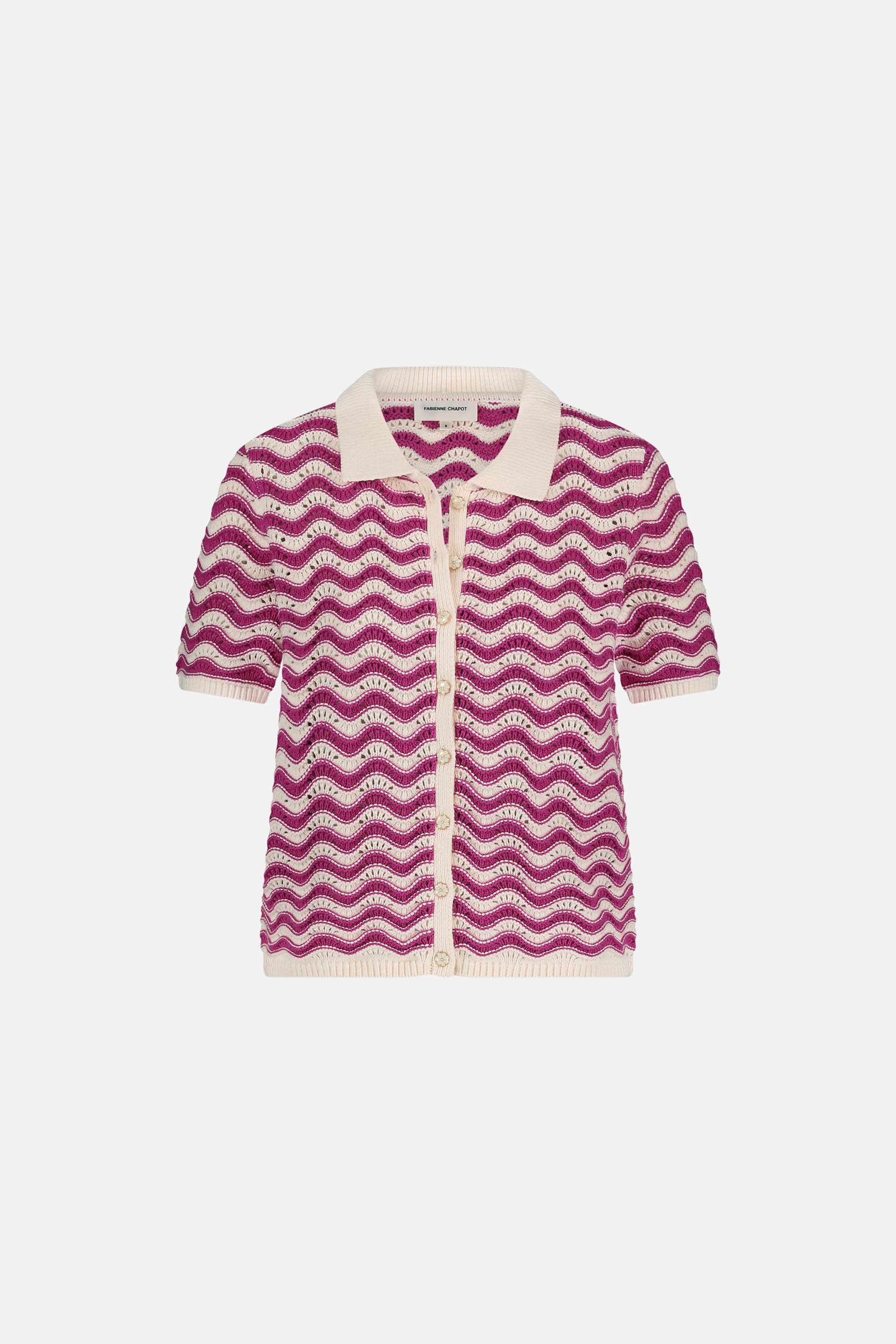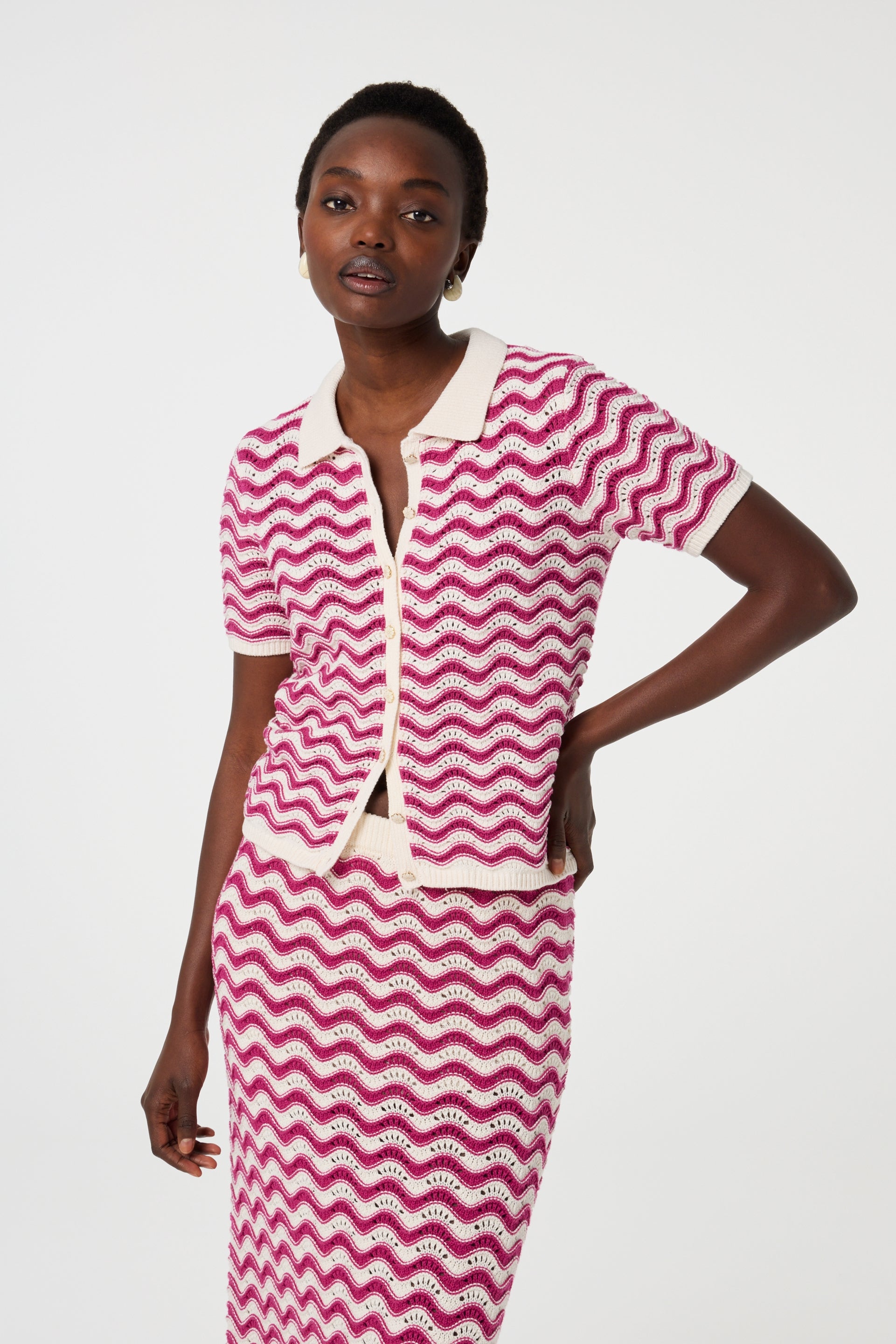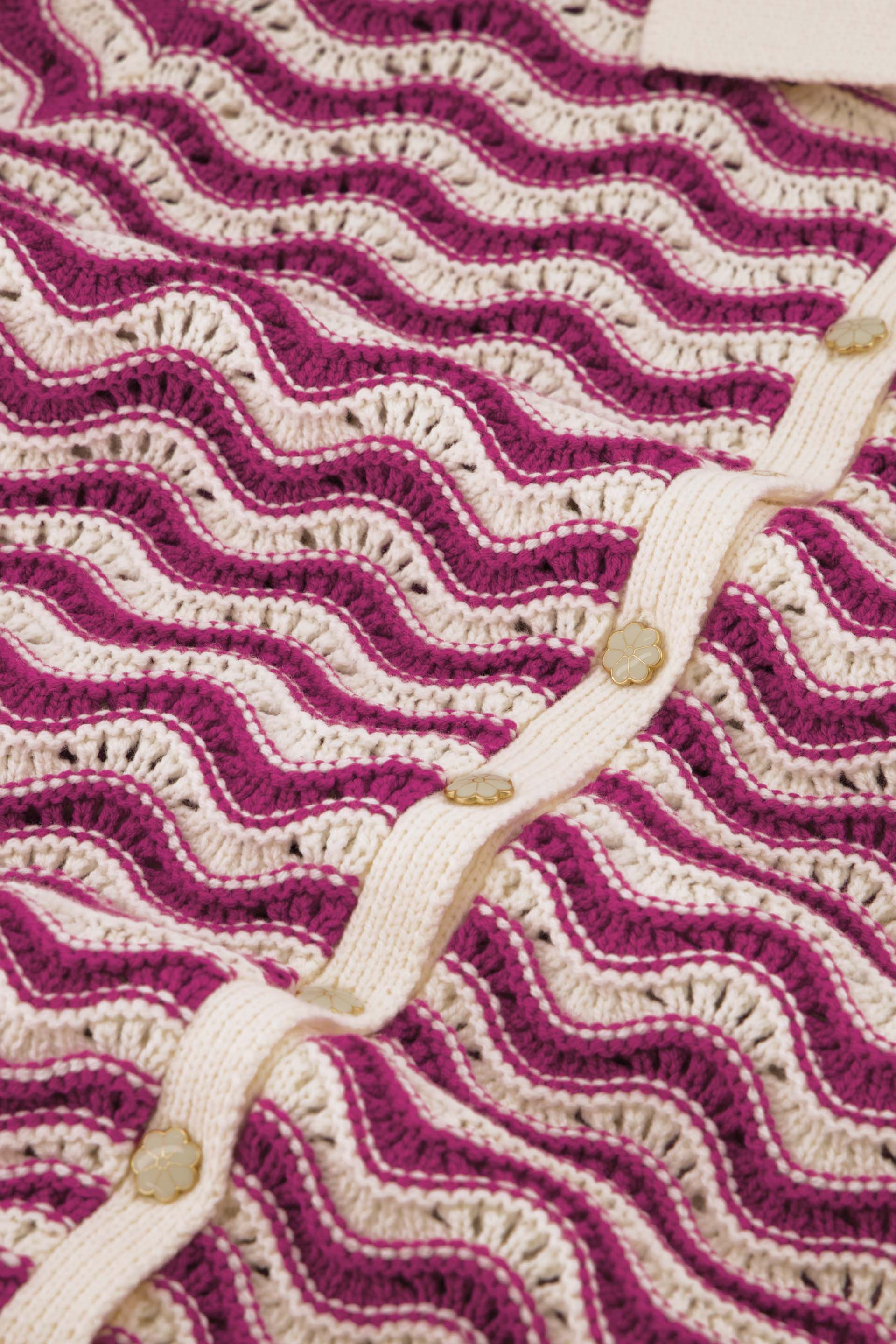 This cardigan showcases a classic pink and white striped crochet design with a unique twist—wave-shaped stripes that adds a playful touch. Featuring a standard collar and it is crafted from a comfortable cotton mix