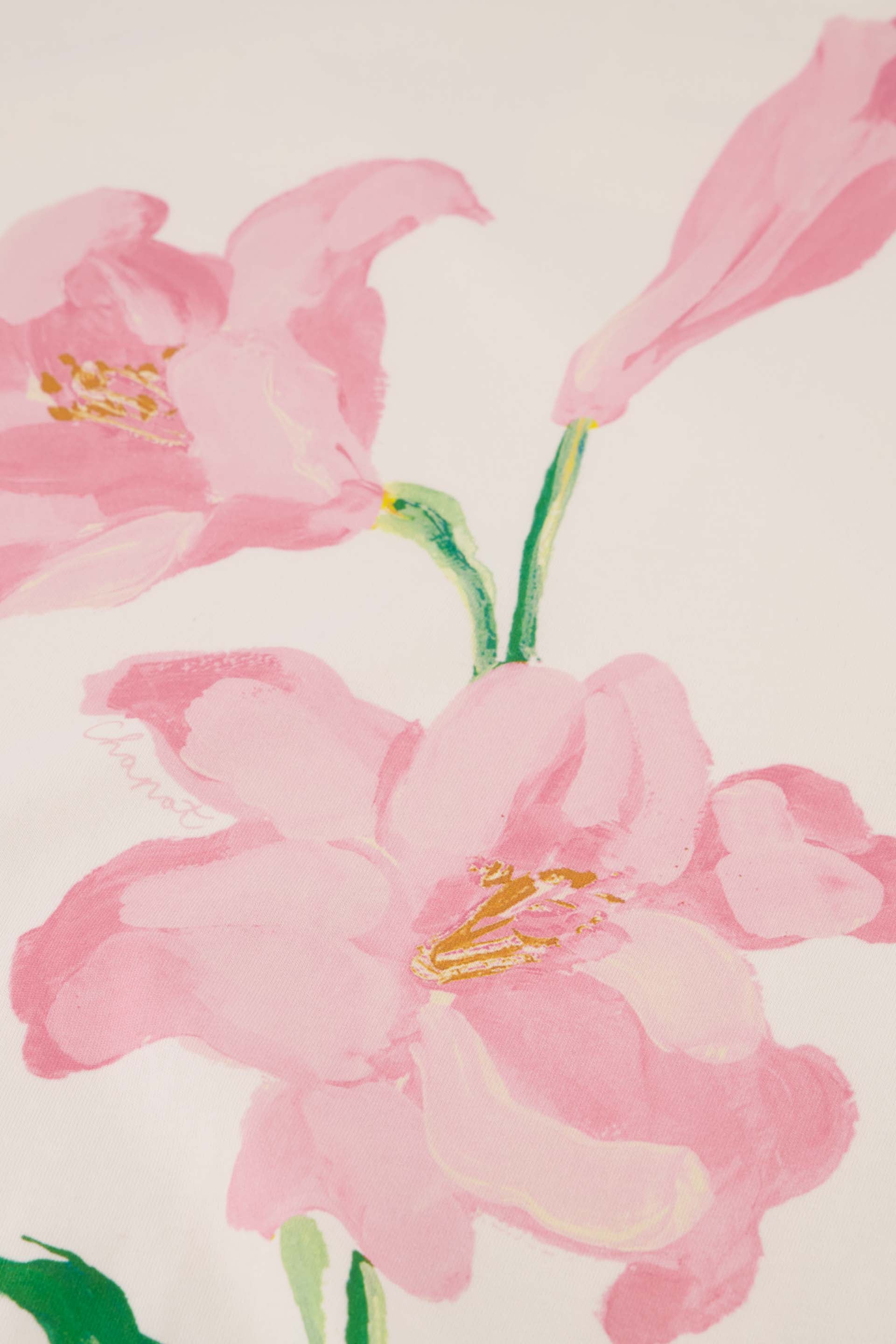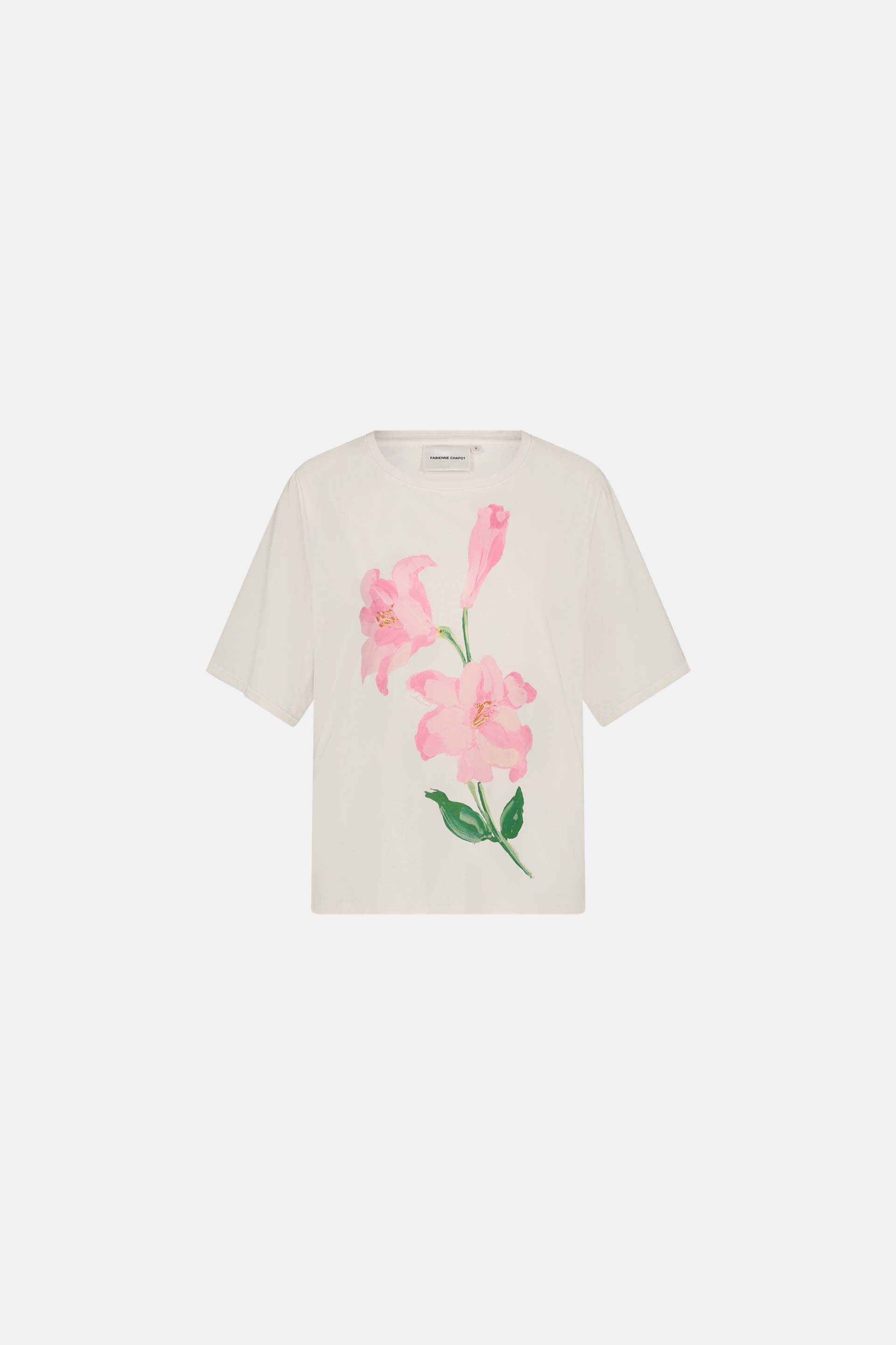 This oversized t-shirt with pink flowerprint on the front, has a round neckline and short sleeves. The Fay T-shirt is made of 100% of organic cotton: soft, comfortable and sustainable.
