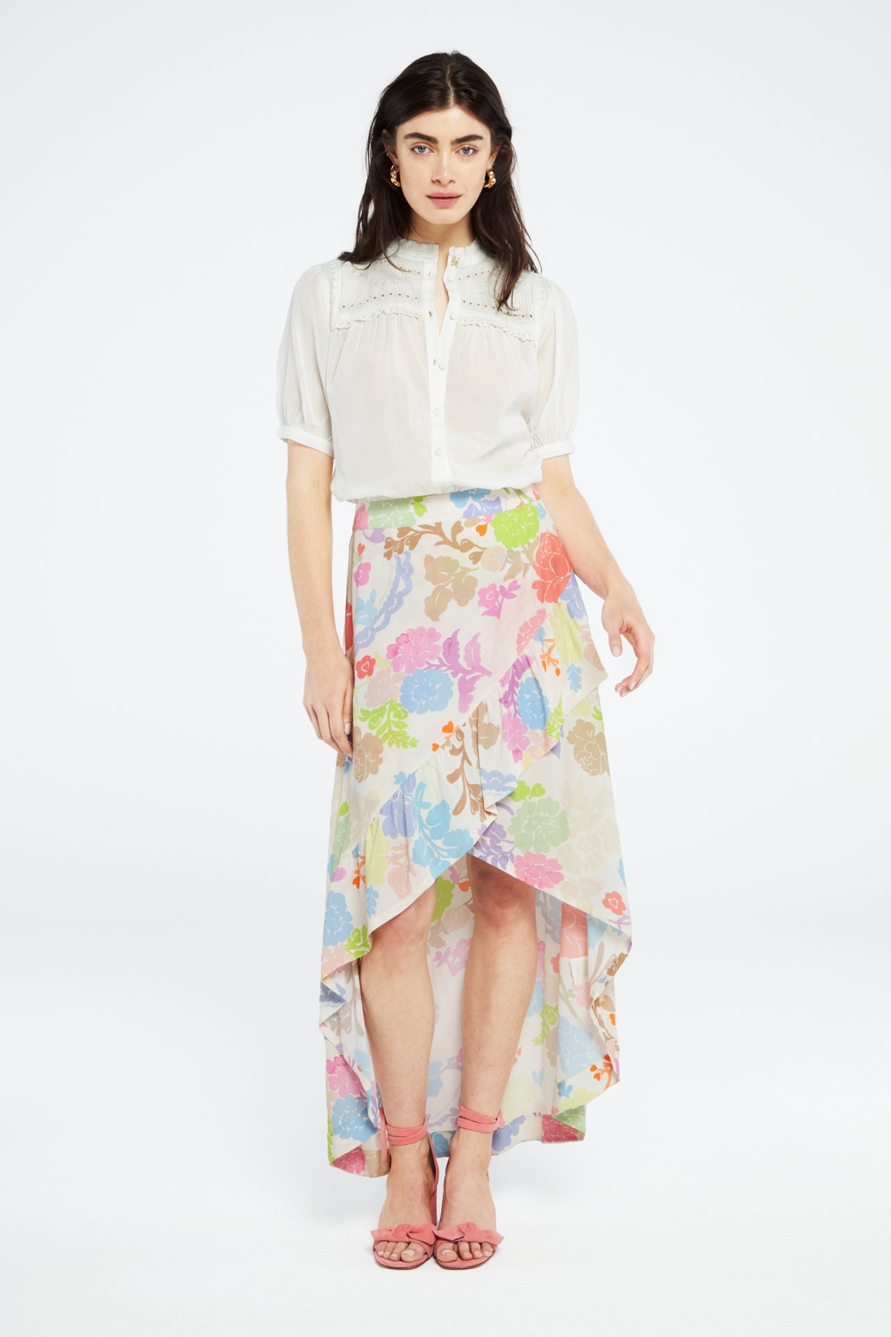 Long shawl skirt with shorter front panel. Kaia Skirt has an elastic waistband at the back and a blind side zipper closure. This skirt features an all-over Caribbean Chintz print. This item is made of 54% LENZING™ ECOVERO™ Viscose: breezy, supple and conscious. LENZING™ and ECOVERO™ are trademarks of Lenzing AG.