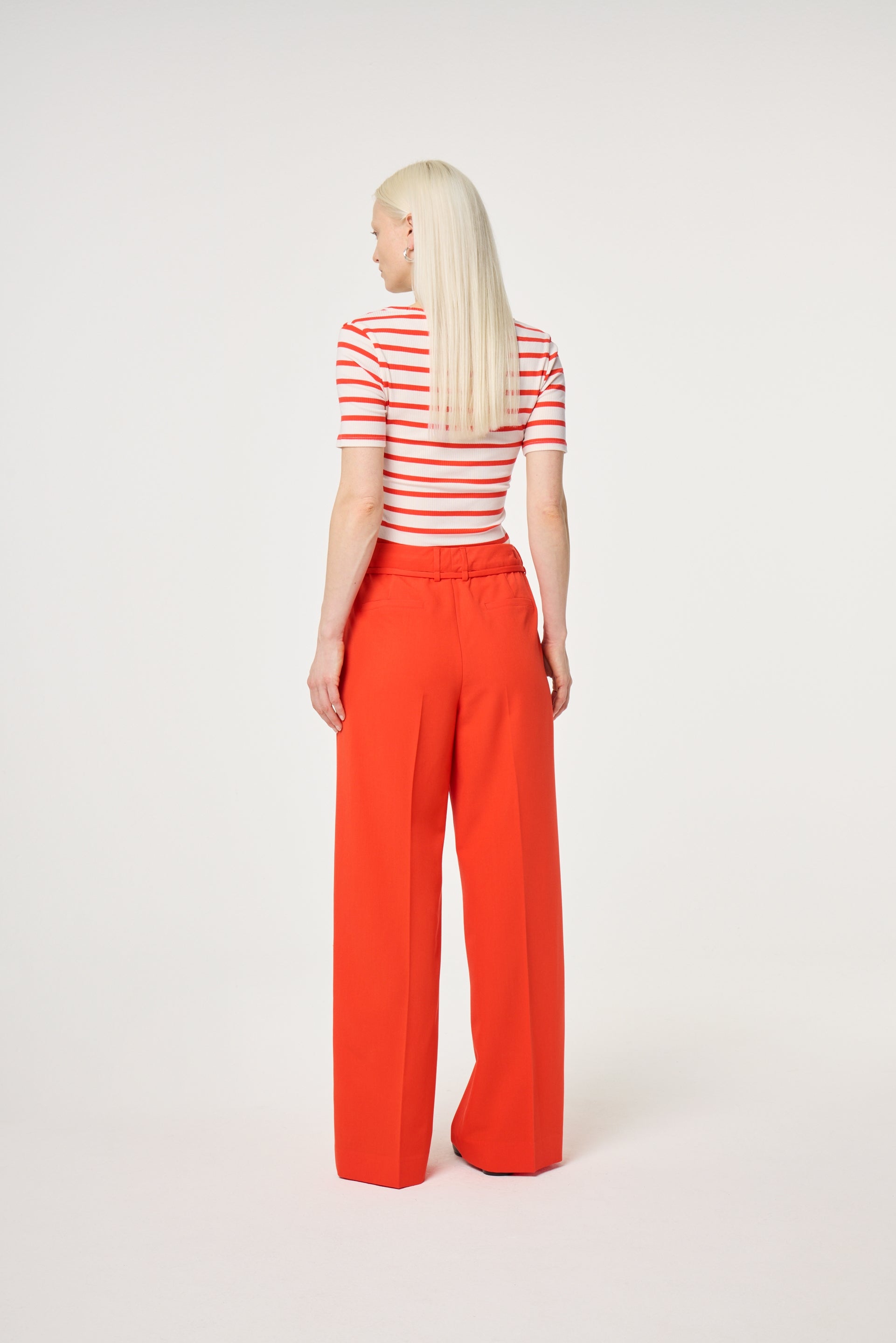 A slim-fit short sleeve T-shirt in clean white with bright tangerine horizontal stripes. Finished with a classic round neckline, it’s an easy everyday piece that feels fresh and flattering. Perfect for casual days, weekend errands, or layered under a jacket.