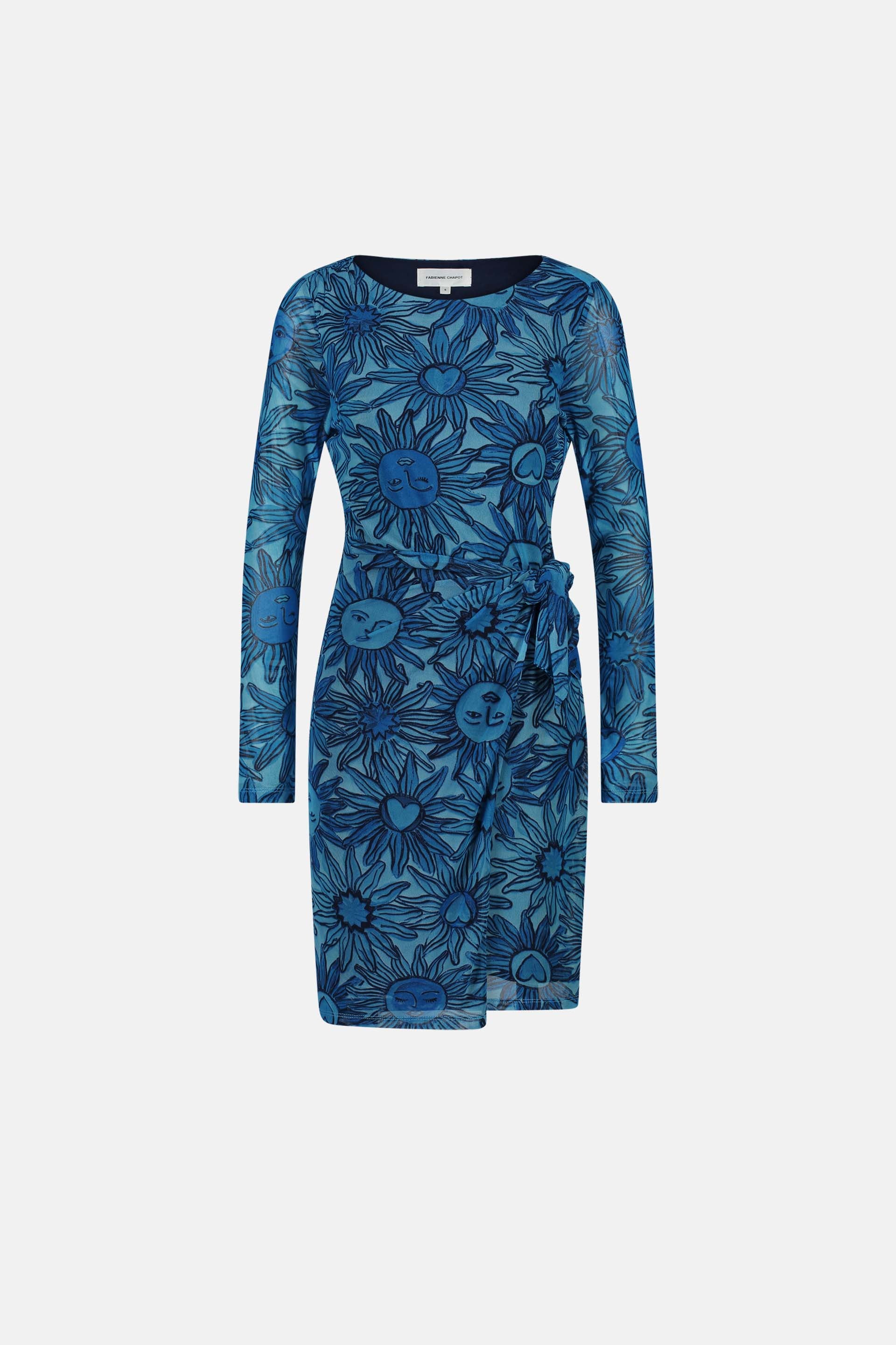 This women’s wrap dress in blue with an all-over sun print features a round neckline, long sleeves, and a short length. It is a feminine dress, perfect for adding a pop of color to your wardrobe.
