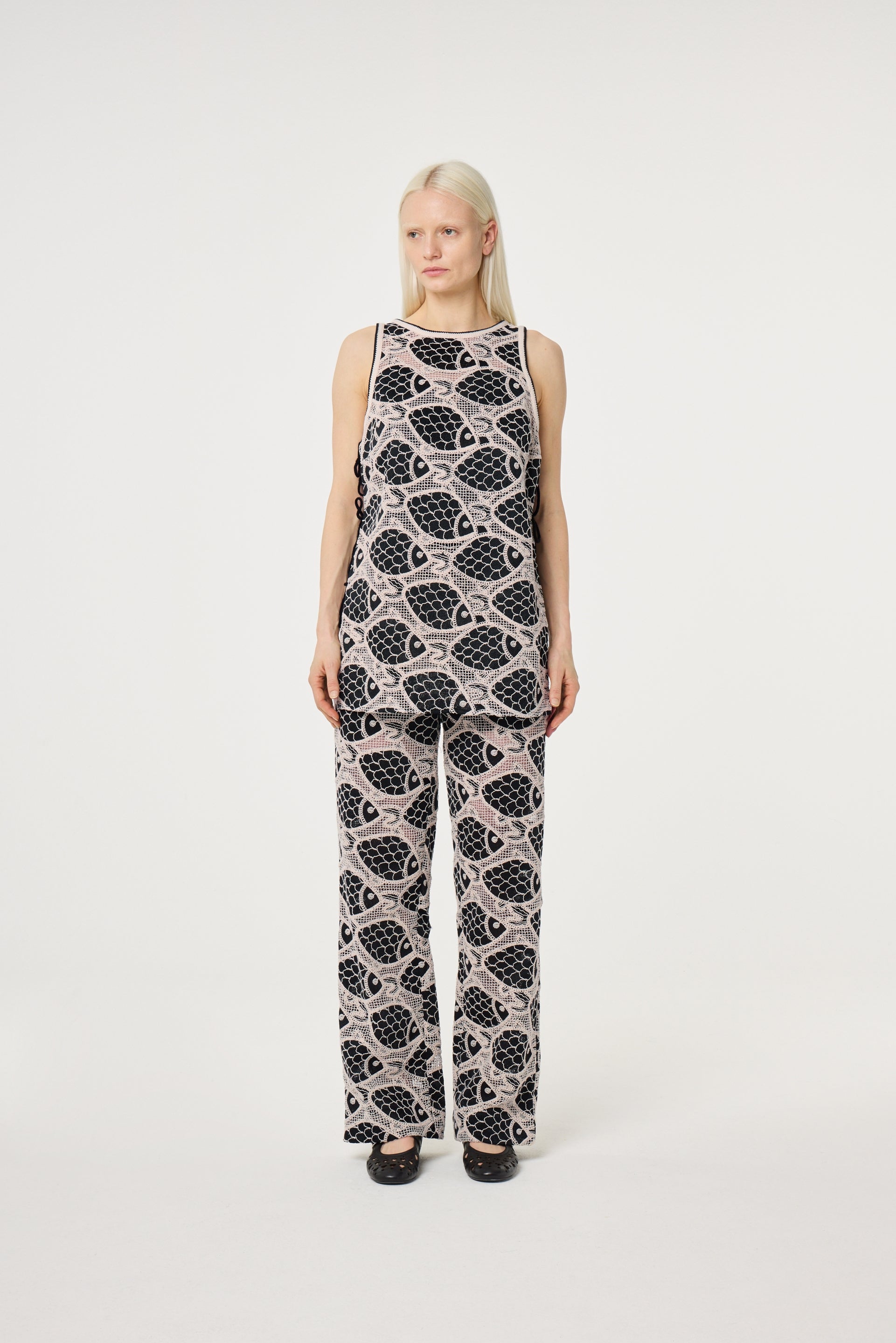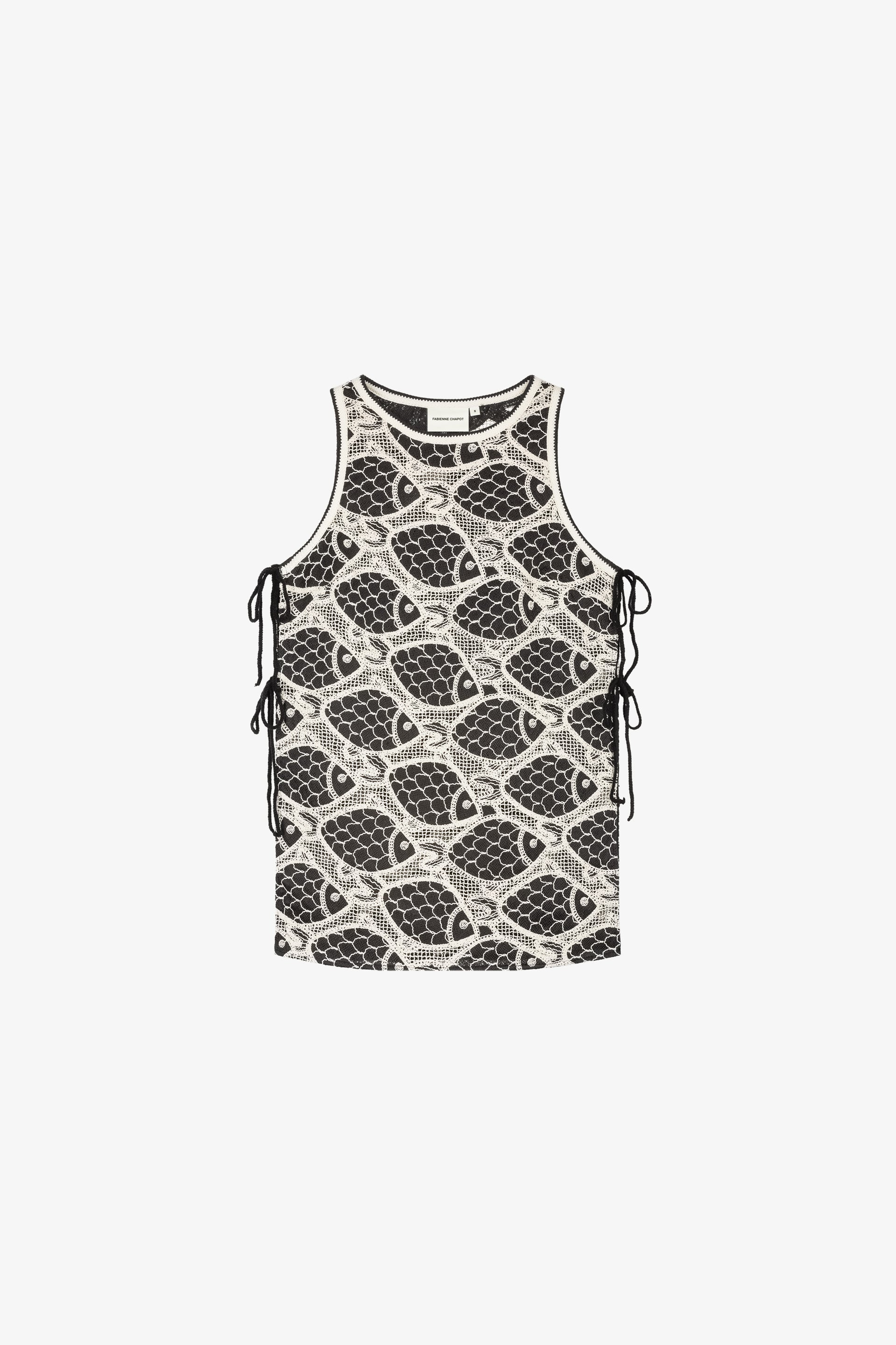 This sleeveless top features an intricate, all-over fish pattern in a bold black and cream contrast for a unique look. Designed with a longline silhouette, it features a clean crew neckline and a relaxed fit through the body. The open-mesh knit construction provides a lightweight and breathable feel, making it an ideal choice for effortless spring or summer layering.
