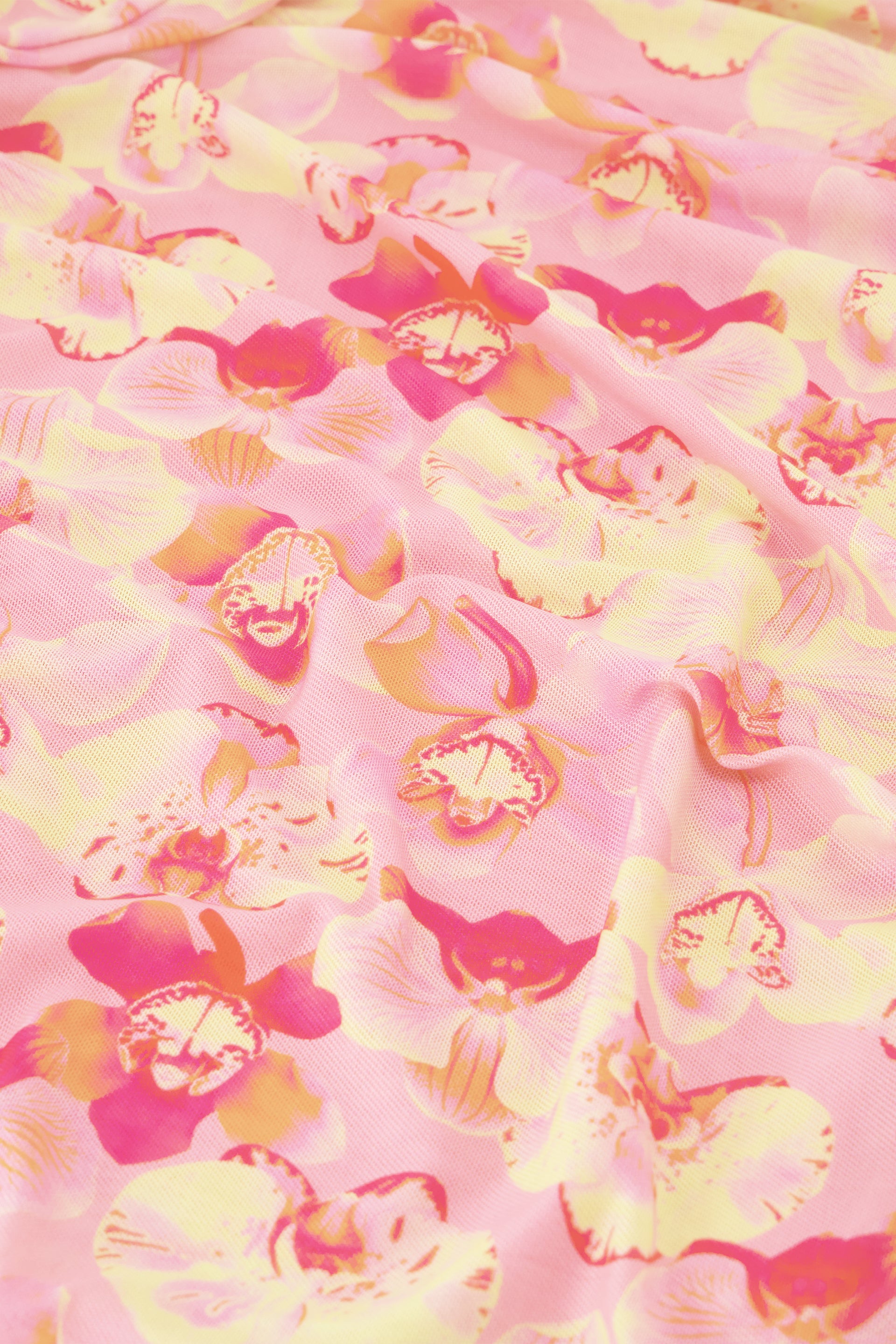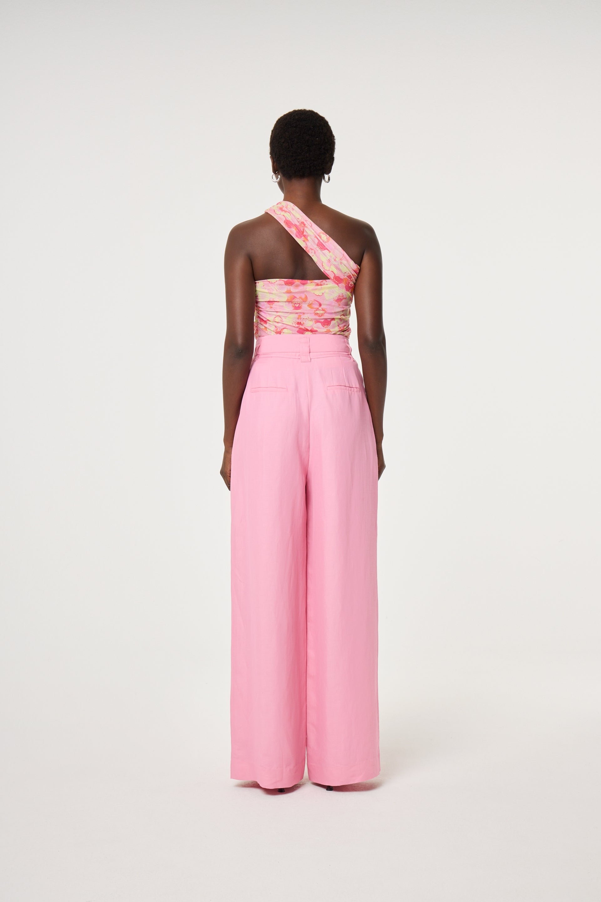 This vibrant pink Ora Top features an all-over floral print. Designed with a unique one-shoulder silhouette, the piece is detailed with a special twisted strap and intricate ruched fabric through the body for a textured, figure-flattering fit. This top is a perfect choice for adding a bold, vacation-inspired energy to your spring wardrobe.