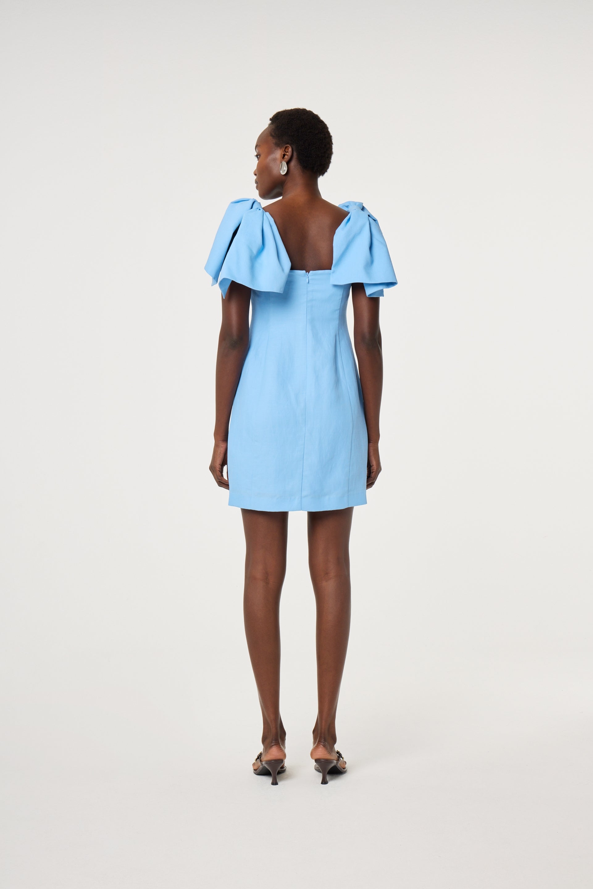 The sky-blue Pio Dress makes the perfect spring mini dress for special occasions. It is designed with a slim fit and a modern square neckline, defined by voluminous puff sleeves. Crafted for a contoured look, this mini transitions effortlessly from a refined daytime aesthetic with cute flats to a high-fashion evening look when paired with a metallic clutch.