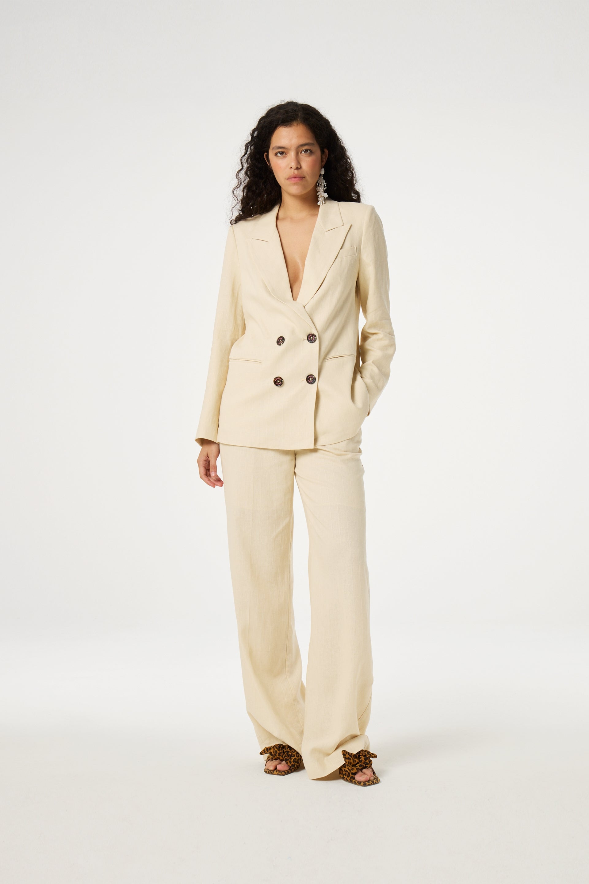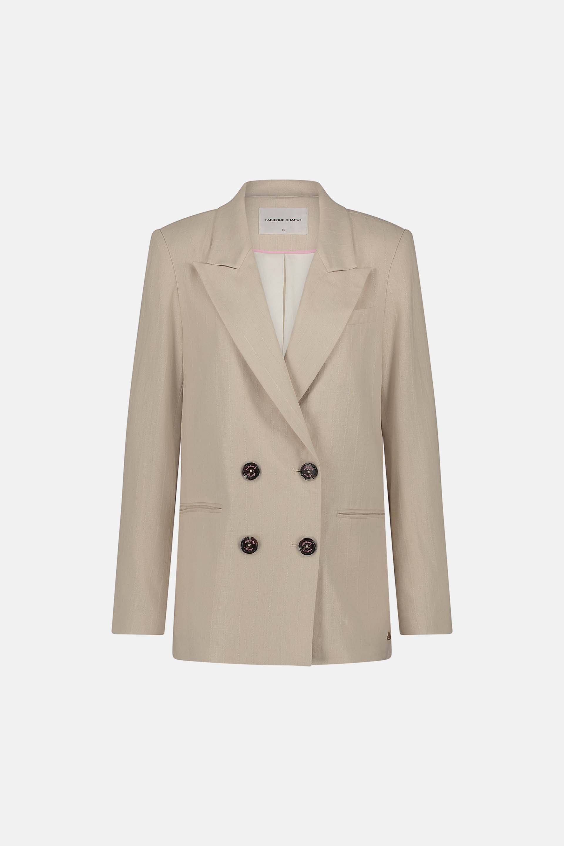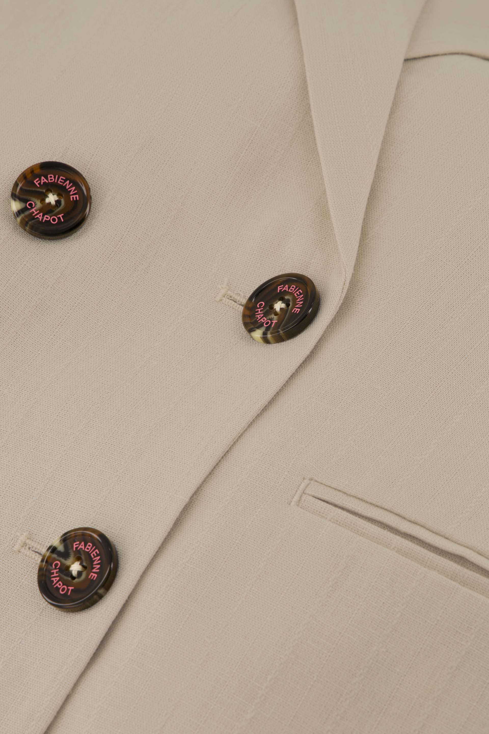 This regular-fit beige blazer is made from a blend of linen and viscose. It features a double-breasted button closure for a classic look. Pair it with your favorite jeans for a simple and stylish outfit.