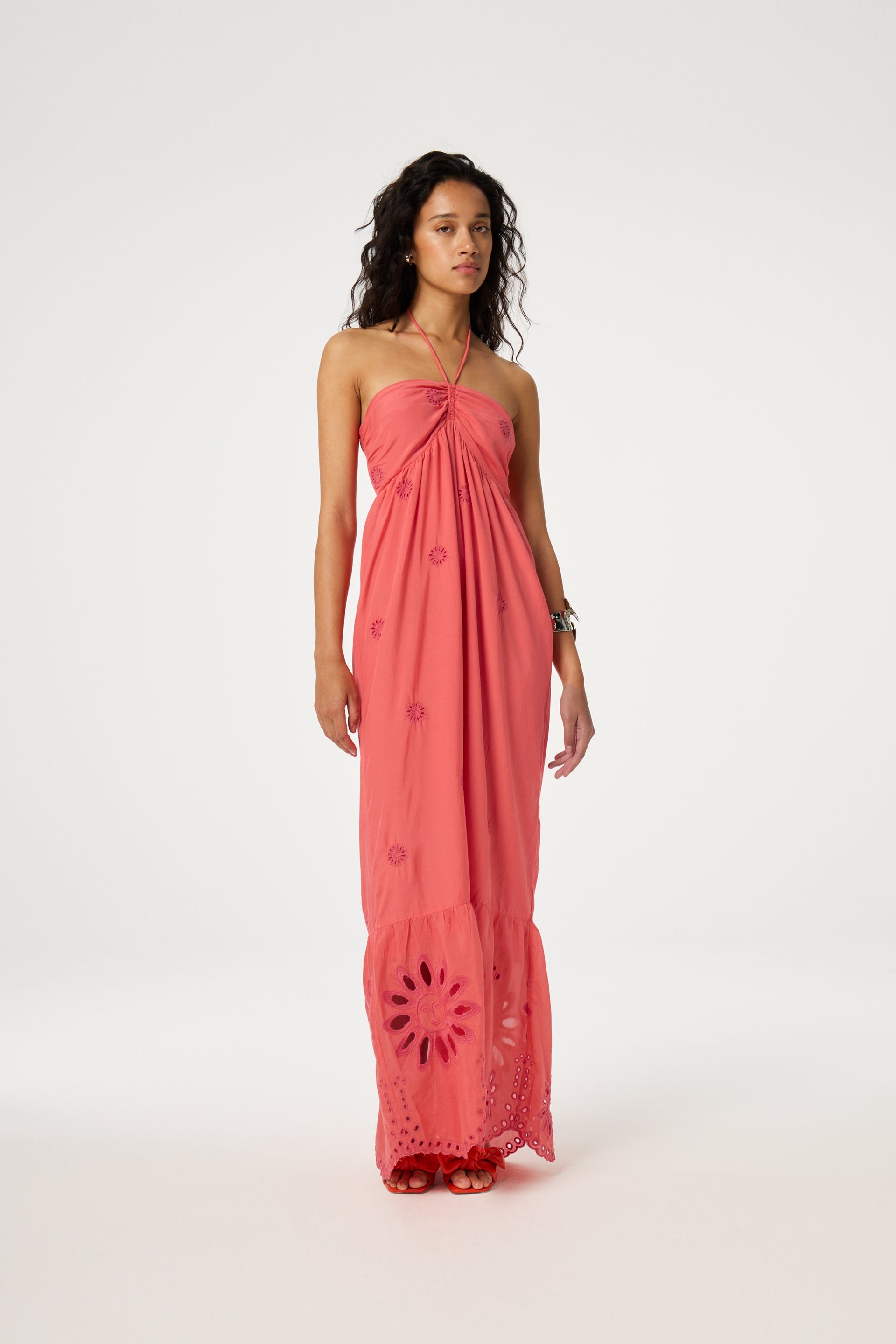 This long off-shoulder dress in coral is made from a soft viscose-cotton blend. Embellished with elegant sun embroidery, it's the perfect piece for stylish summer days.