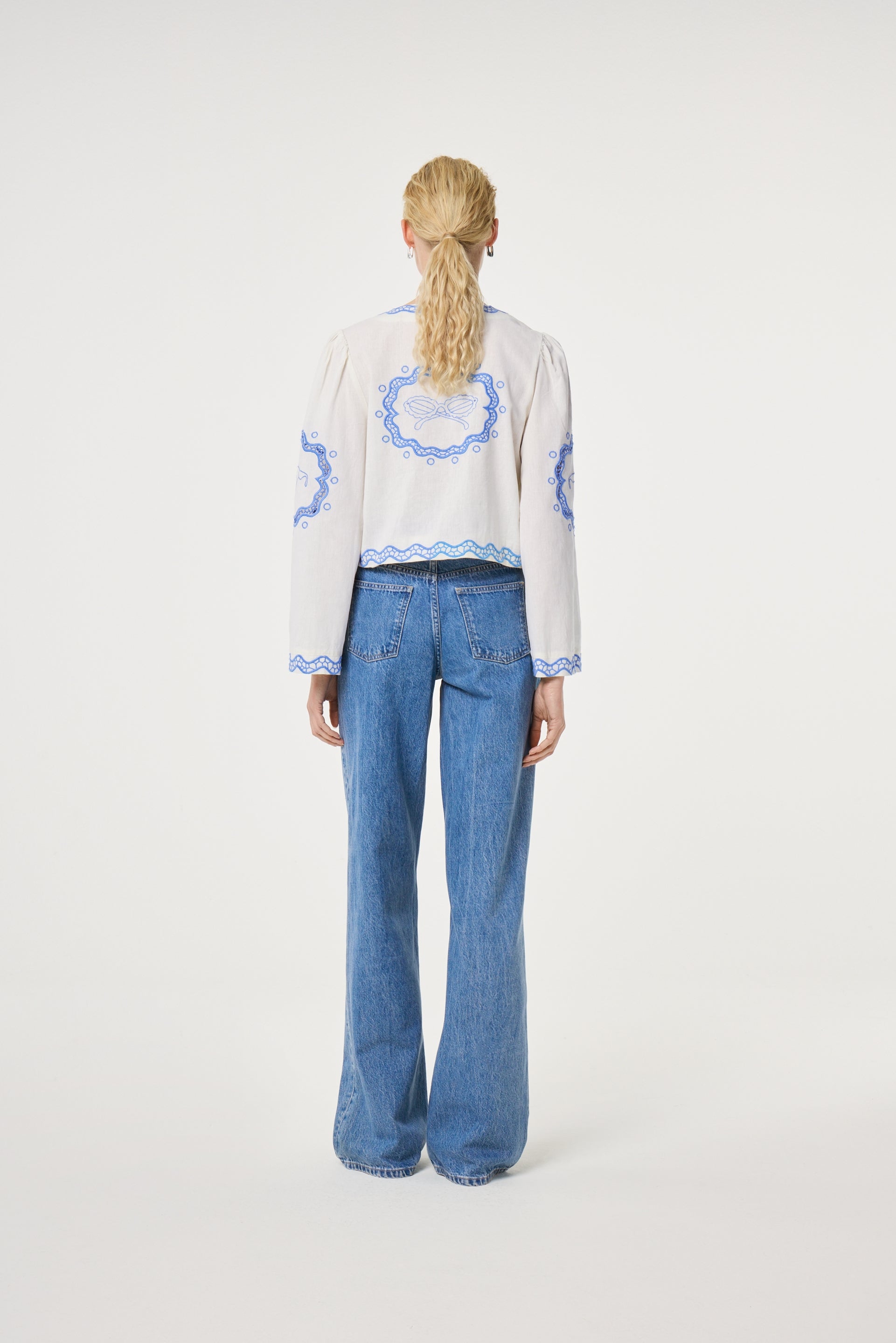 This blouse features charming blue scalloped embroidery along the neckline, cuffs, and hem. Designed with a relaxed, cropped silhouette and voluminous long sleeves, the piece is uniquely detailed with three delicate blue ribbon ties at the front for a feminine, open-closure look. Pair this statement blouse with high-waisted wide-leg jeans for an effortless weekend outfit, or style it with a sleek mini skirt for a more preppy look.