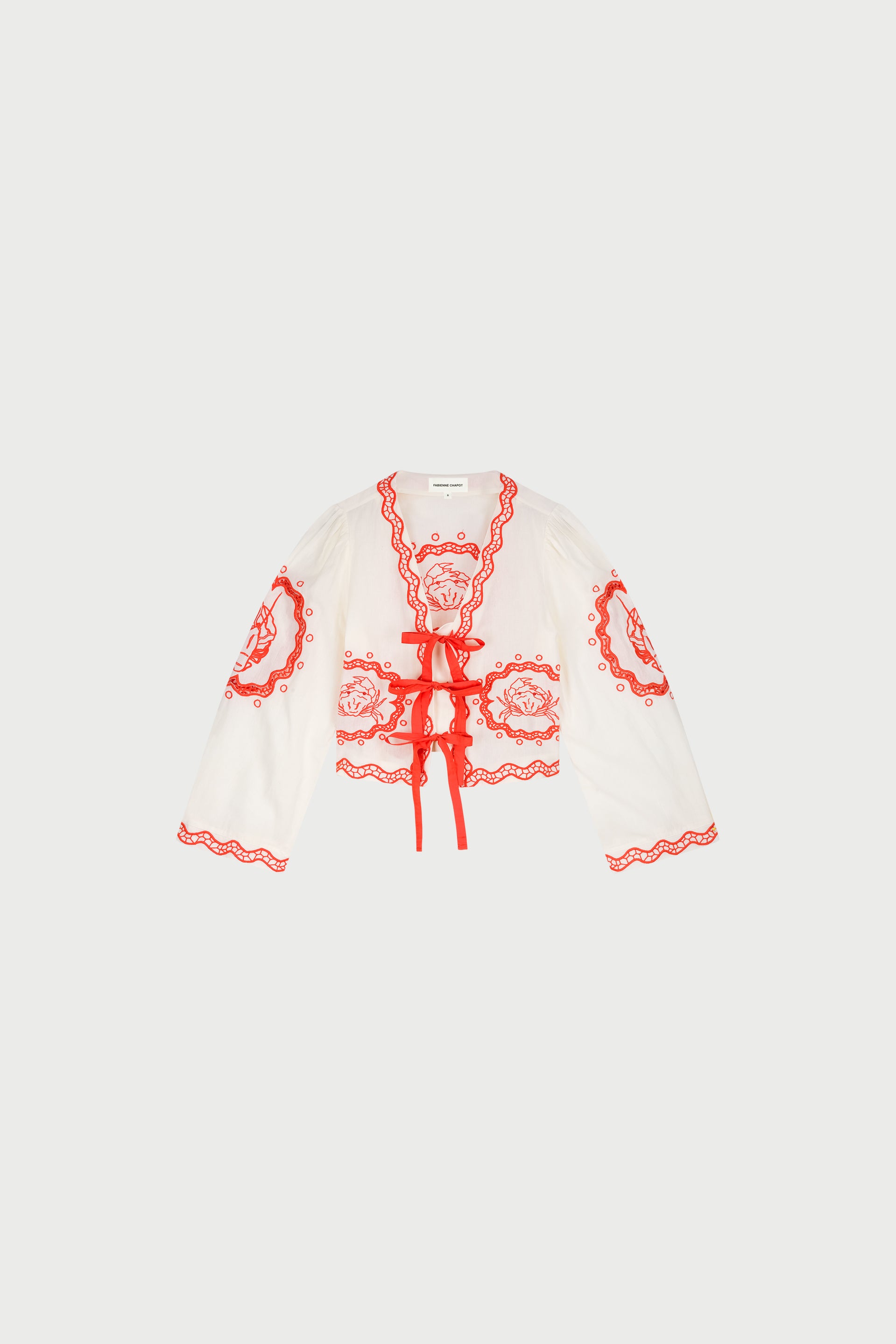 This white long sleeve blouse is sprinkled with playful tangerine prints for a cheerful, standout look. Designed with an open front and delicate ribbon ties, it features softly wavy edges for added charm. Crafted from a breathable cotton blend, it’s perfect for relaxed office days, creative gatherings, or sunny strolls.