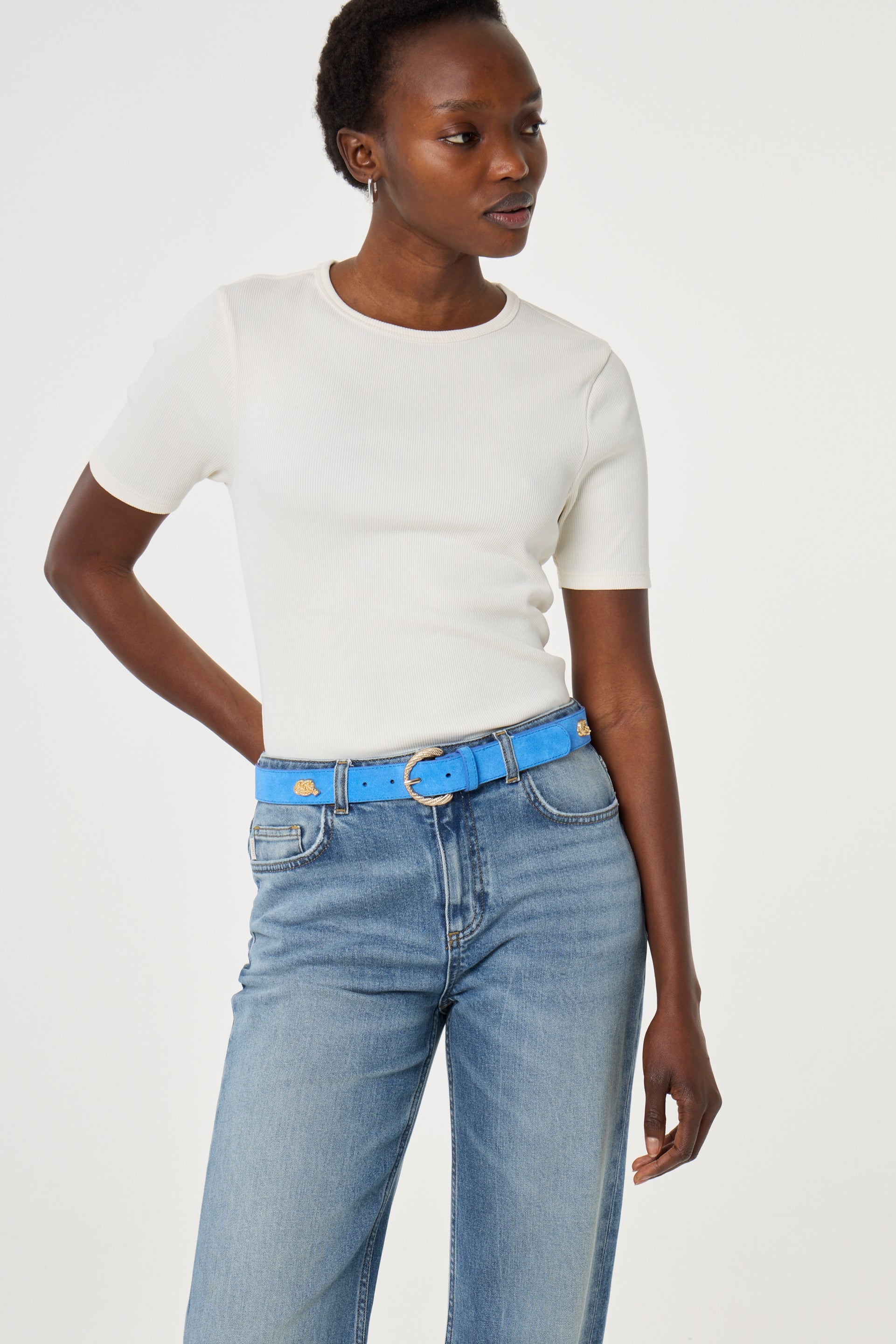 This blue belt is crafted from 100% cow leather and defined by a sculptural gold rope-style buckle. Finished with a delicate knot detail, it brings a refined yet distinctive accent to both casual and dressed-up outfits.